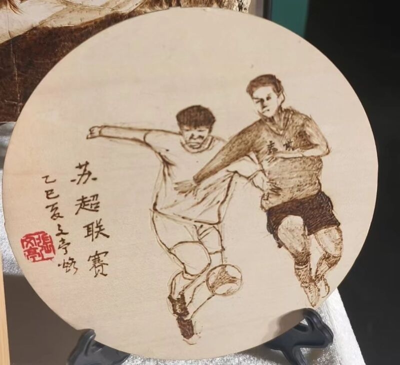 “蘇超”賽場不僅是競技的舞臺,更是各個城市文化軟實力的展示窗口。海陵的非遺傳承人紛紛以足球為主題進行創作:泰州篆刻代表性傳承人許建民刻下賽場英姿,海陵烙畫代表性傳承人張文亭的作品再現激烈對抗,泰州面塑代表性傳承人黃寶富捏制出栩栩如生的球員形象……傳統技藝與體育精神的碰撞,讓觀眾在熱血賽事中感受到傳統文化的深厚底蘊。