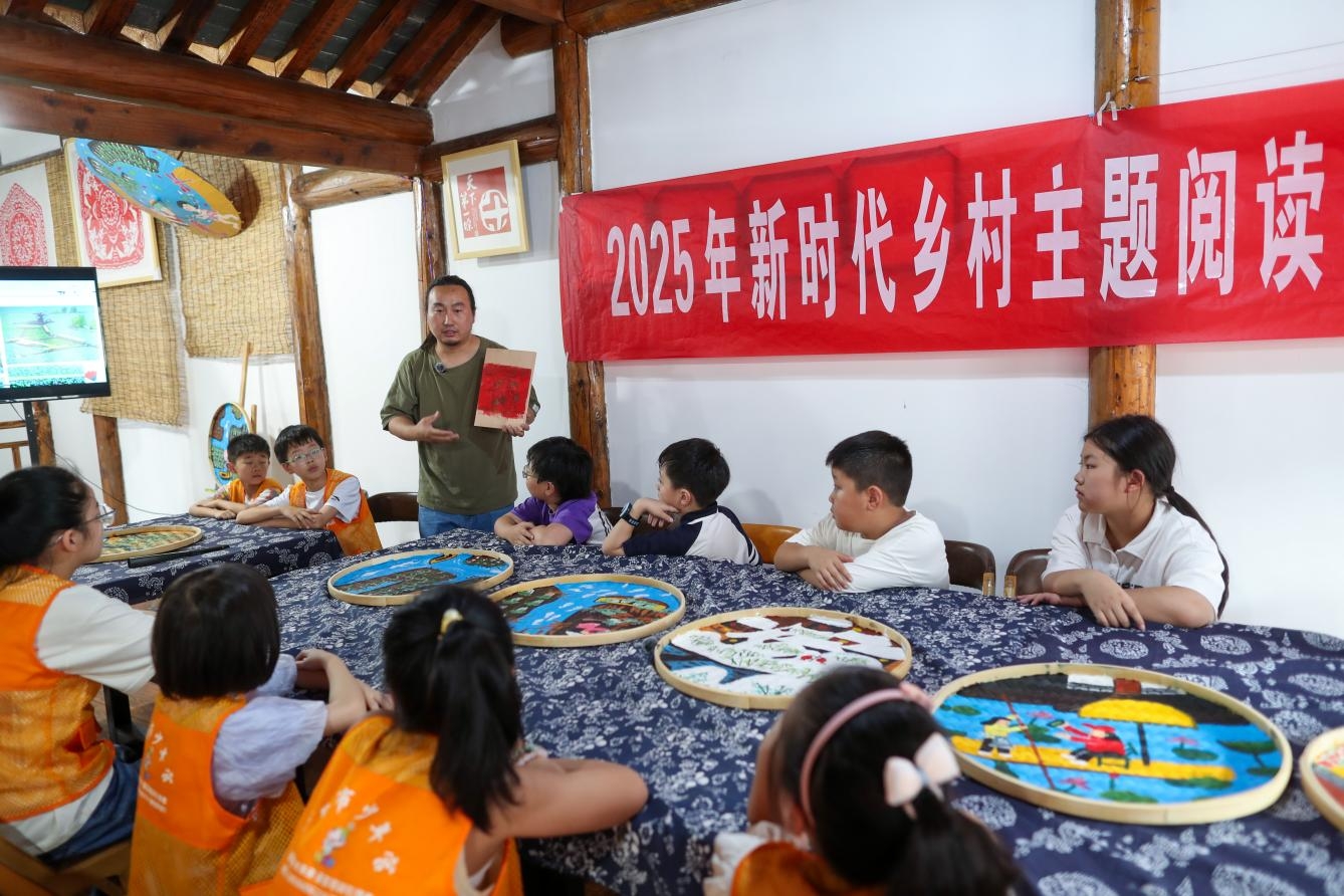 在閱讀推廣人的帶領下,孩子們一起參觀了工作室,非遺興化垛田農民畫代表性傳承人解善彪現場講解農民畫作品,開啟了一場兼具知識性與實踐性的書香之旅。垛田農民畫是由農家自娛創作發展為地方特色民間藝術符號,其“垛田色譜”取自鄉土色彩,魚船等圖案寄托“年年有余”“一帆風順”希望。解善彪重點介紹了代表作《閱讀希望》,該作品以讀書為題材,描繪“垛上人”讀書的場景,展現了農民畫“源于生活、高于生活”的創作理念。
