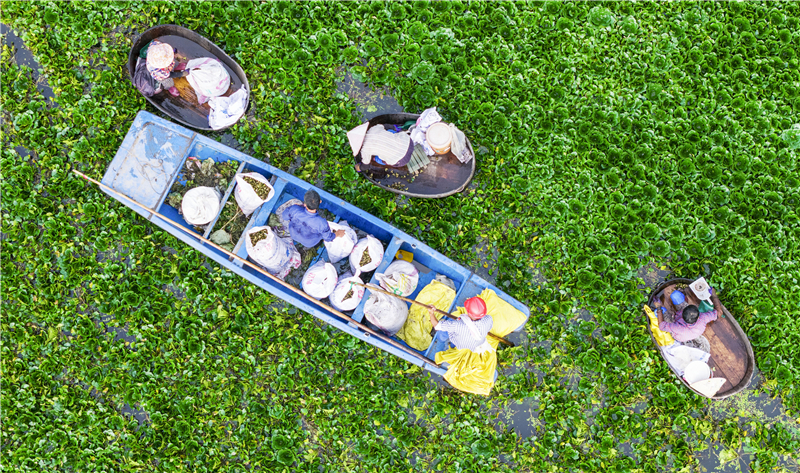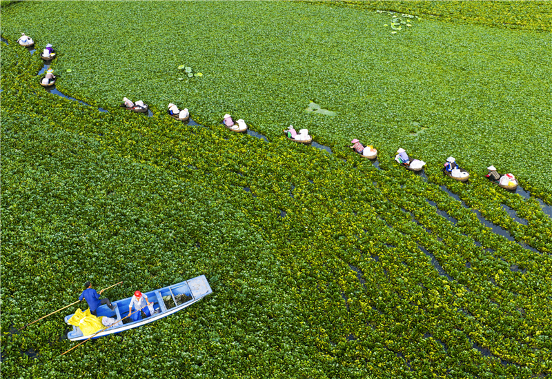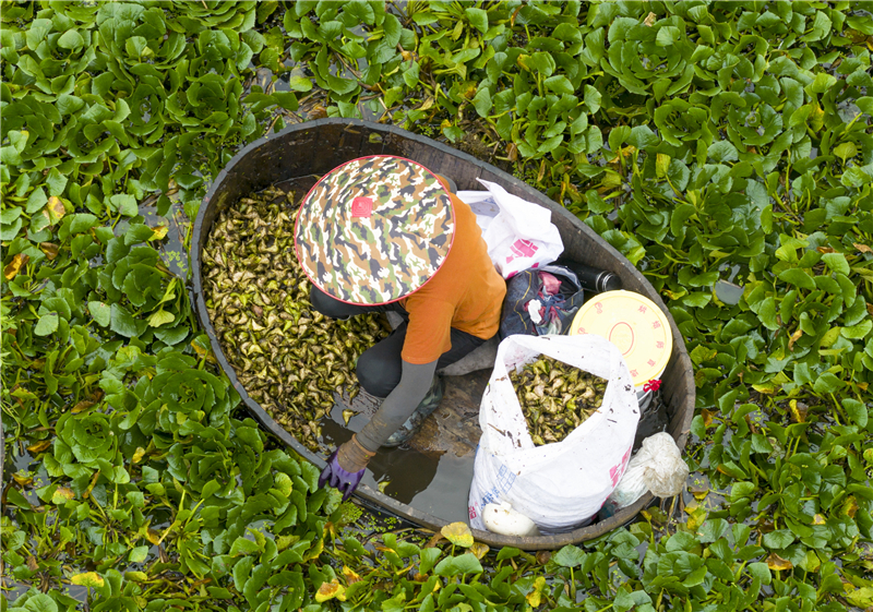8月7日,江蘇省泰州市姜堰區(qū)淤溪鎮(zhèn)武莊村農(nóng)民在采摘菱角。(許大才 攝)