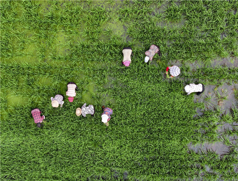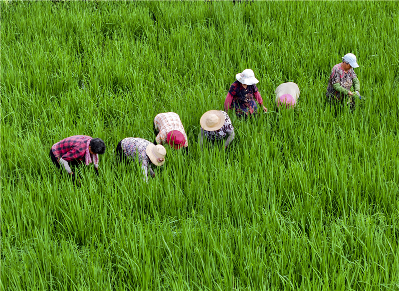 8月7日,江蘇省泰州市海陵區(qū)蘇陳鎮(zhèn)夏鄭社區(qū)農(nóng)民在田間拔除雜草。(顧繼紅 攝)