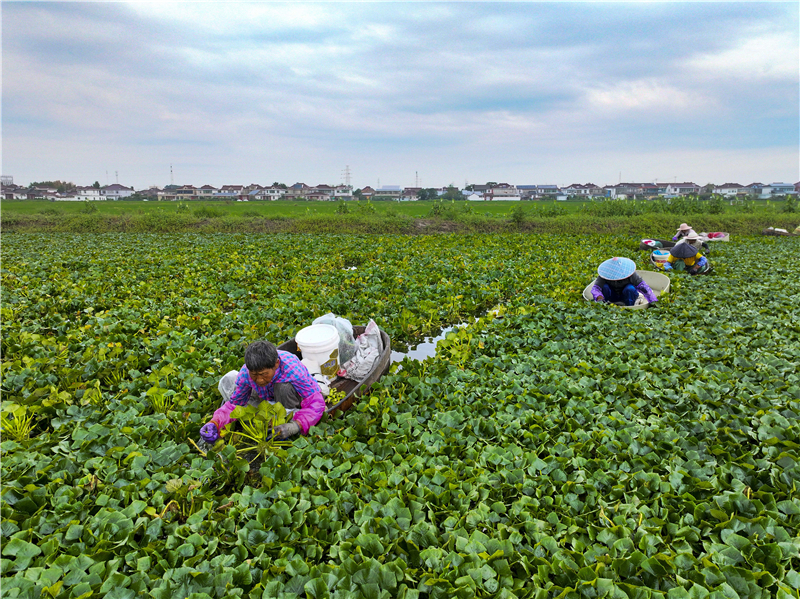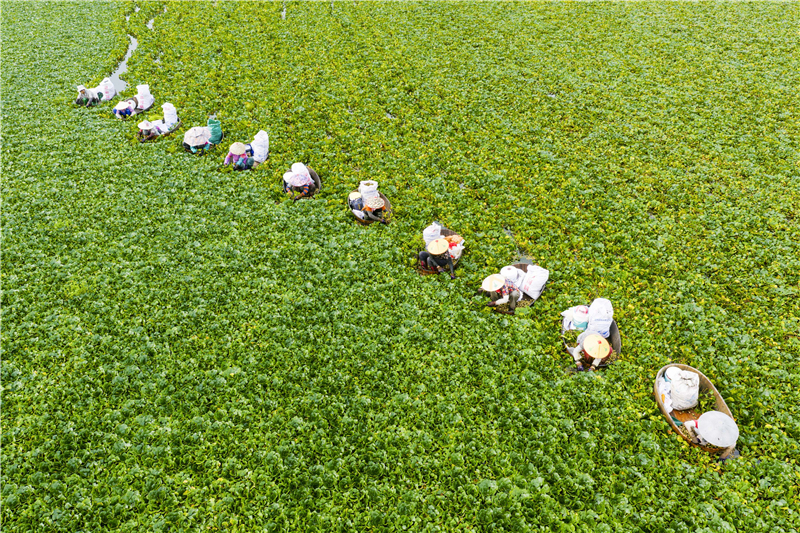 8月7日,江蘇省泰州市姜堰區(qū)淤溪鎮(zhèn)武莊村農(nóng)民在采摘菱角。(劉崗 攝)