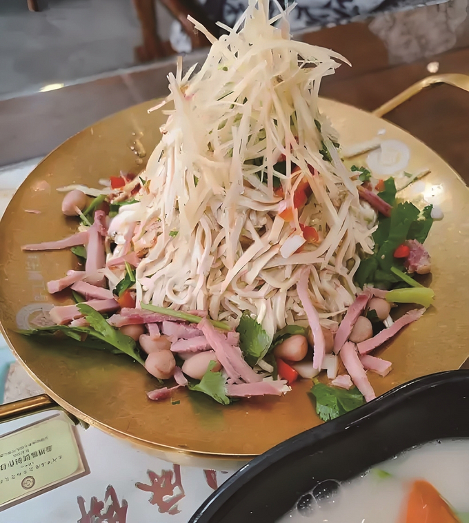 對文化的恪守,讓海棠春始終懷揣對品質(zhì)的敬畏之心。掌柜袁海峻深諳“食養(yǎng)同源”之道,將中醫(yī)食補理念融入菜品研發(fā),推行“四季菜品、節(jié)令飲品”的經(jīng)營模式。每到秋冬時節(jié),溫?zé)岽己竦亩節(jié){便成為茶社的暖心標(biāo)配;而從春分至秋分,傳承百年的酸梅湯則準(zhǔn)時上線。這酸梅湯的配方,源自袁海峻外曾祖、泰州名中醫(yī)陳木卿,酸甜沁涼的口感既能消暑降溫、生津止渴,又不傷脾胃陽氣,成為食客夏日必點的“解暑良方”。 在海棠春,與掌柜一同守護品質(zhì)的,還有一群技藝精湛的匠人,其中兩位70高齡的非遺傳承老師傅尤為引人注目——制作干絲的劉明喜與擅長“跳面”的蔣廣義。劉明喜深耕干絲制作60載,練就了一手“一騎絕塵”的刀工:一塊普通豆干,經(jīng)他之手先橫削成20片薄如蟬翼的豆干片,再豎切成細(xì)如發(fā)絲的干絲,最終制成的燙干絲鮮嫩爽滑、細(xì)膩入味,入口滿是豆香與醬香的交融。而蔣廣義的“跳面”工序,更是將“食”與“藝”完美結(jié)合:他端坐于特制木棍上,以身體重量反復(fù)彈跳壓制面團,這充滿觀賞性的動作不僅是對傳統(tǒng)技藝的堅守,更讓面團在反復(fù)擠壓中形成細(xì)密的“呼吸孔”——用這樣的面團制成的面條,口感筋道彈牙,能充分吸收泰州特色魚湯的醇香,二者搭配堪稱“天作之合”。兩位老師傅帶來的五味干絲與魚湯跳面,憑借獨有的風(fēng)味,成為讓食客魂牽夢繞的“招牌”“王牌”。 貼心服務(wù) 以需求為要,傳遞市井溫情