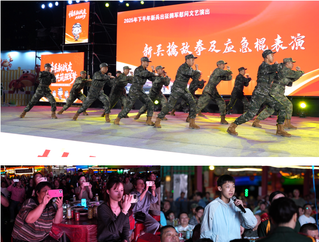 ▲擁軍志愿者用表演傳遞對新兵的敬意 晚會以“豐碑永鑄”“熱血當(dāng)歌”“不忘初心”“強(qiáng)軍有我”四大篇章為脈絡(luò),巧妙將紅色記憶與強(qiáng)軍夢想融入每一個節(jié)目,讓觀眾在欣賞演出的同時,深刻感受家國情懷。紅色故事《銀杏樹下》感人至深,講述者娓娓道來姜堰本土的革命往事,臺下觀眾聽得入神,不少人悄悄紅了眼眶;歌伴舞《樹梢上的芭蕾》以柔美舞姿,生動展現(xiàn)陸軍航空兵飛行員“云端起舞”的颯爽風(fēng)采;最令人熱血沸騰的當(dāng)數(shù)新兵們的表演——擒敵拳剛勁有力,應(yīng)急棍揮舞有聲,褪去青澀的他們隊(duì)列整齊、口號響亮,滿是“時刻準(zhǔn)備赴軍營”的堅(jiān)定信念,臺下歡呼聲響徹夜空,久久回蕩。互動環(huán)節(jié)同樣熱鬧非凡,國防知識問答一經(jīng)開啟,觀眾紛紛舉手搶答,從“中國人民解放軍宗旨”到 “全民國防教育日”,大家在趣味答題中學(xué)習(xí)國防知識,“擁軍愛軍”的種子也悄然在每個人心中扎根。