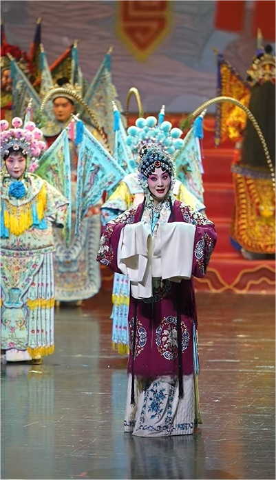 人文“三水”是泰州的特色文化符號:《水滸》為民而書,涌動的是擔(dān)當(dāng);水墨為民而繪,展露的是風(fēng)骨;水袖為民而舞,傳承的是魂脈。“泰州是座有戲的城市。”傅希如明白,他在《丹桂記》《蓄須記》中對梅先生的演繹,不僅是向大師致敬,更是向五百萬泰州人民深情獻(xiàn)禮——“戲比天大,人民比天更大”! 關(guān)于戲曲匯的舞美設(shè)計與呈現(xiàn),導(dǎo)演唐經(jīng)瀚提及兩處亮點(diǎn)。其一是《大師的相遇》場景,中西合璧、東西和鳴。1930年,梅蘭芳和卓別林在美國相遇、合影。西方有默劇,東方有戲曲,中西交融的呈現(xiàn)方式,將兩位藝術(shù)家共同抗?fàn)幏ㄎ魉沟撵`魂吶喊渲染得入木三分。另一處則是戲曲舞蹈與芭蕾舞的同臺演出,創(chuàng)新大膽、柔美大氣,時尚中洋溢出青春氣息。 傳承之光 梅派薪火代代傳 活動現(xiàn)場,觀眾聚焦泰州梅蘭芳京劇團(tuán)特邀演員王艷。她領(lǐng)銜獻(xiàn)演《穆桂英掛帥》選段——《捧印》,盡顯大將愛國風(fēng)范,完美展現(xiàn)傳統(tǒng)戲曲的當(dāng)代傳承。“泰州,我非常熟悉,因為熱愛梅派藝術(shù),這里水美人更美。”王艷說,之前,泰州梅蘭芳京劇團(tuán)邀請她帶領(lǐng)青年演員一起排演,這對于梅派京劇的傳承十分有意義。“我們當(dāng)代京劇人肩負(fù)著繼承、傳承的責(zé)任。”中秋節(jié)快到了,她祝泰州戲迷朋友們節(jié)日快樂,也希望大家走進(jìn)劇場,欣賞、了解、熱愛我們的國粹藝術(shù)。