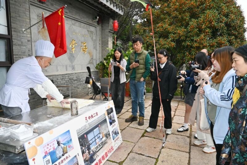 在百年老店海棠春茶社門前,泰州非遺“蔣氏跳面”第四代傳承人蔣廣義現(xiàn)場展示了絕活“手工跳面”。只見他輕盈跳躍,通過人力彈跳壓打面團,最終制成勁道十足的面條。這一傳統(tǒng)技藝引得留學生們連連稱贊。 “這里的建筑風格與我家鄉(xiāng)完全不同,每一塊磚瓦似乎都在訴說著故事。”留學生們紛紛表示要把這些照片分享給家鄉(xiāng)的朋友。 隨后的桃園、梅園之行,更讓大家領(lǐng)略到了中國古典園林的精致之美。作為一座紀念清代戲曲家孔尚任的園林,桃園以其精巧的布局和深厚的文化內(nèi)涵令人贊嘆。園內(nèi)陳庵、石舫等景點,再現(xiàn)了《桃花扇》創(chuàng)作時的場景,讓留學生們在移步換景中了解到中國古典文學與園林藝術(shù)的完美融合。