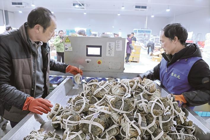 ▲智能分揀大大提高工作效率。 暫養池旁,工人們手指翻飛,平均10秒就能捆扎好一只螃蟹,掛上特制“身份蟹扣”,掃描二維碼便可查看產地、捕撈日期、暫養天數及檢測報告。“透明溯源能大大提升消費者信任度,契合大家對食品安全的高要求。”孫傳萍說。 捆扎好的螃蟹被轉運至分揀區,智能化設備與人工默契配合。記者看到,蟹倉引進的智能分揀系統,可根據重量、尺寸自動分檔,傳送帶上的螃蟹經電子秤和攝像頭檢測后,精準分配至不同出口。“通過這個智能系統,5筐蟹,3名工人不到10分鐘就能分揀完成。而純人工,5個人至少要1小時。”工人郭師傅說。 分揀完成的螃蟹,被送入溫度嚴格控制在7至11攝氏度的冷庫保鮮區。“這是螃蟹的‘休眠溫度’,既能降溫保活,又不會凍傷。”孫傳萍說,打包前螃蟹會先“預冷”,逐步適應低溫,為長途運輸做好準備。打包車間內,工人們按訂單需求過秤檢查,將螃蟹裝入特制保溫箱,內置冰袋和保濕材料,兼顧低溫與濕度,保障運輸途中“安全舒適”。 “江浙滬地區36小時內送達,存活率保證95%以上。”孫傳萍告訴記者,春節前后,蟹倉運輸網絡覆蓋全國,日均出貨量8000至1萬斤。 夜幕降臨,蟹倉的燈光依舊明亮,工人們仍在忙碌備貨。 辭舊迎新之際,一只只河蟹從水鄉興化出發,奔赴全國各地的新年餐桌,傳遞著里下河地區的美味與新春祝福。