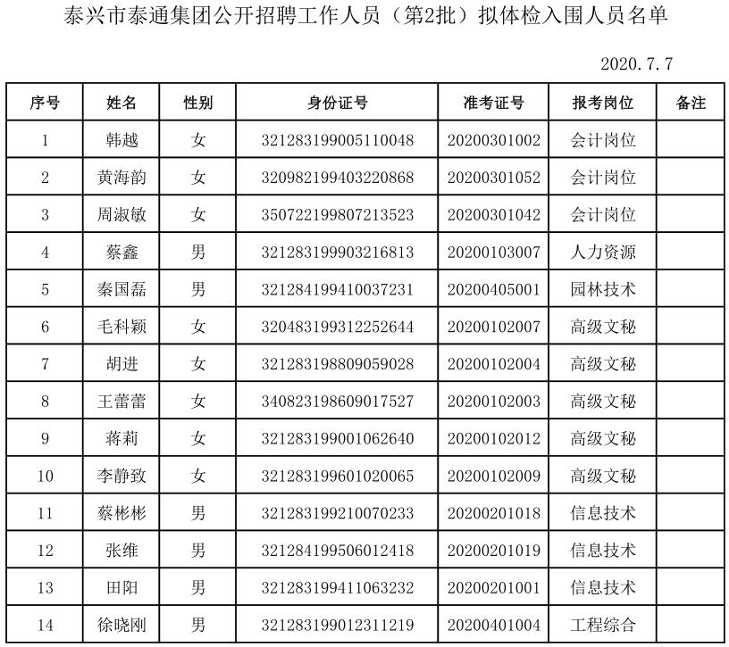 附件:2020年泰興市泰通集團(tuán)公開招聘人員體檢名單
