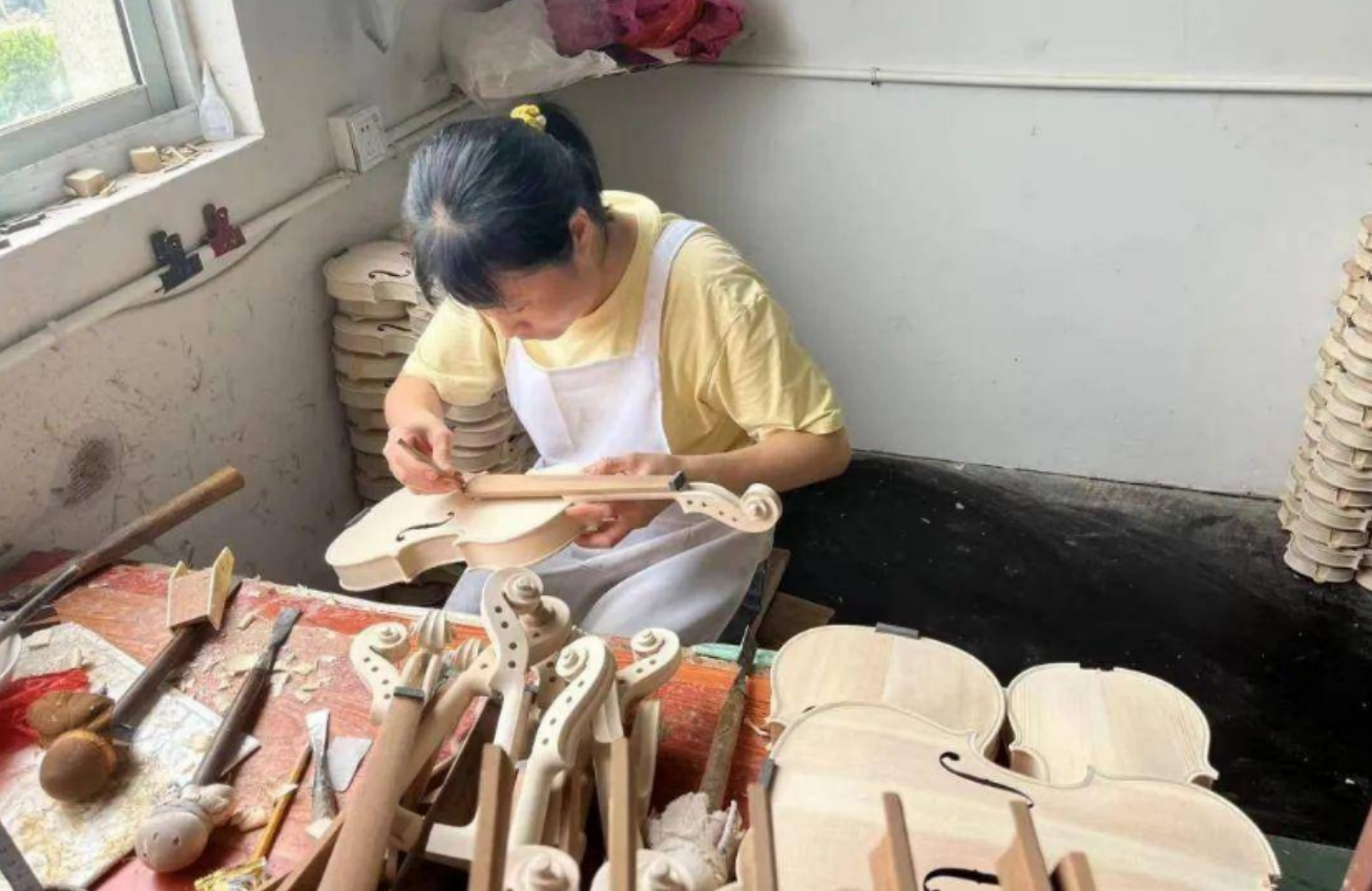 人民參與特色產業發展,發展成果由人民共享。今年“6.21國際樂器演奏日”活動后,鳳靈樂器有限公司各大車間有點忙。在裝頭車間,今年46歲的向春美,熟練地用刀削切琴身頂端的凹槽,并不停地將琴頭按上進行比對,確保琴頭的榫頭與凹槽完全吻合。她一天能裝100到150只琴頭,每月收入3000元到4000元。“提琴制作有120道工序,去年生產大、小琴近20萬把。今年的訂單來不及做,我們正加班加點。”鳳靈樂器有限公司行政部長何永承介紹。