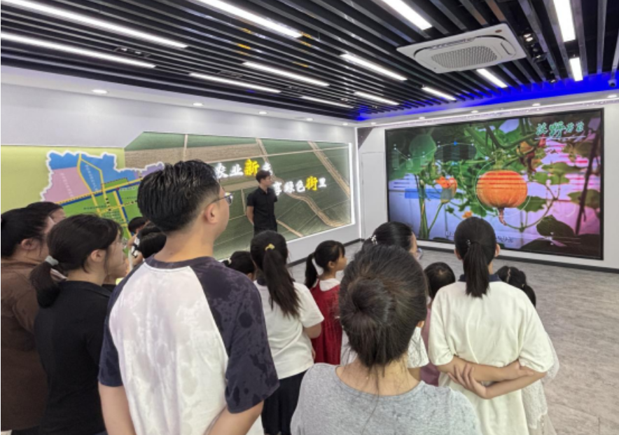 8月15日,泰興市國家現(xiàn)代農(nóng)業(yè)產(chǎn)業(yè)示范園科技孵化展廳,迎來了一批“特殊學(xué)員”——一群朝氣蓬勃的大學(xué)生。展廳內(nèi),新街鎮(zhèn)地形地貌沙盤從側(cè)面展示了新街鎮(zhèn)現(xiàn)代農(nóng)業(yè)發(fā)展的壯闊歷程。“今年的中央一號文件就給我們的農(nóng)村農(nóng)業(yè)工作指明了方向,著力壯大縣域富民產(chǎn)業(yè),就是要發(fā)展鄉(xiāng)村特色產(chǎn)業(yè)、完善聯(lián)農(nóng)帶農(nóng)機制、拓寬農(nóng)民增收渠道。”志愿者講解員向大家解讀了今年的中央一號文件精神,并講述了新街鎮(zhèn)現(xiàn)代農(nóng)業(yè)發(fā)展進(jìn)程,以及園區(qū)最新的種植品種和種植技術(shù)。大學(xué)生們紛紛提問,還探討了電商模式、物流成本和品牌打造等問題,對用好“新農(nóng)具”、干好“新農(nóng)活”、做好“新農(nóng)人”有了更生動的理解,也對“互聯(lián)網(wǎng)+農(nóng)業(yè)”的廣闊前景充滿期待。 在現(xiàn)代農(nóng)業(yè)展廳的大屏幕前,孩子們和家長們一同觀看了新街鎮(zhèn)現(xiàn)代農(nóng)業(yè)宣傳片,宣傳片生動展現(xiàn)了新街鎮(zhèn)現(xiàn)代農(nóng)業(yè)的嶄新面貌:從傳統(tǒng)農(nóng)耕到智慧管理的飛躍。“大家看,我們的大棚里安裝了各種傳感器,對陽光、溫度、濕度、土壤養(yǎng)分進(jìn)行實時監(jiān)測和自動調(diào)節(jié)。就像給莊稼裝上了‘智能管家’,讓它們在最舒適的環(huán)境里生長。”志愿者介紹道。孩子們紛紛睜大好奇的眼睛,開啟現(xiàn)代農(nóng)業(yè)的“探秘之旅”。當(dāng)巨大的屏幕上出現(xiàn)無人機在田野上空飛翔作業(yè)、機械臂自動采摘蔬果的畫面時,孩子們發(fā)出了陣陣“哇”的驚嘆聲。