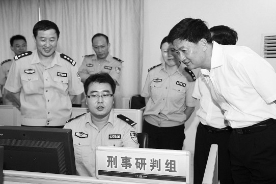 7月27日下午,泰興市委書記張兆江專程到該市公安局調研公安工作,對泰興公安機關和廣大公安民警在維護一方治安穩定、服務一方經濟建設、打擊違法犯罪活動等方面所做的貢獻和取得的豐碩成果給予了高度肯定,并對今后的公安工作提出明確要求。圖為民警向張兆江書記現場演示網上戰法。□陸裕順 吳亞軍 攝