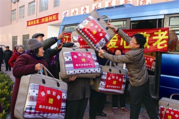 。ㄓ浾 葉桂華 通訊員 葉余華 王 榮)現(xiàn)下,已進(jìn)入數(shù)九寒冬。為確保敬老院老人安全溫暖過冬,泰興市12月27日舉行了“民政惠民生、福彩送溫暖”大型公益活動,1000多床嶄新棉被分發(fā)至各鄉(xiāng)鎮(zhèn)(街道)敬老院,給老人們送去溫暖。 在泰興市區(qū)九久樂養(yǎng)老院,該市民政和福彩中心的工作人員開著中巴車,送去了近100床棉被。今年70多歲的季克信老人高興地打開嶄新的棉被,拉出來給記者看:“顏色真好看,質(zhì)量又好。冬天到了,能收到這樣的禮物,真的是很高興!”自2000年電腦福利彩票在泰興銷售以來,該市每年都舉行“扶老、助殘、救孤、濟(jì)困”福彩公益活動。2011年,民政、福彩中心拿出200多萬元,用于鄉(xiāng)鎮(zhèn)(街道)敬老院生活設(shè)施改造;2012年又出資400多萬元,改善社區(qū)和新農(nóng)村建設(shè);今年又先后組織福彩公益金關(guān)愛留守兒童和殘疾兒童等公益活動。
