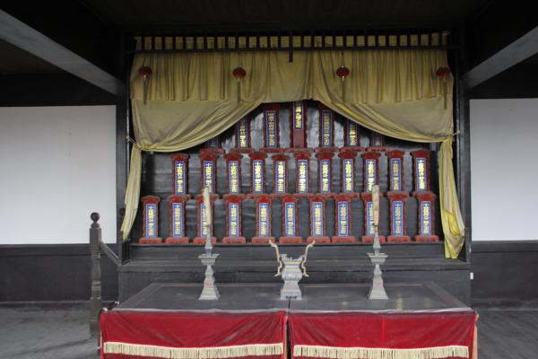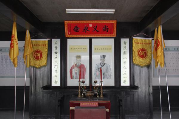 正堂掛黃橋何氏始遷祖孔庭公遺像和明太仆寺少卿何棐像。上懸橫匾:尚義永垂。