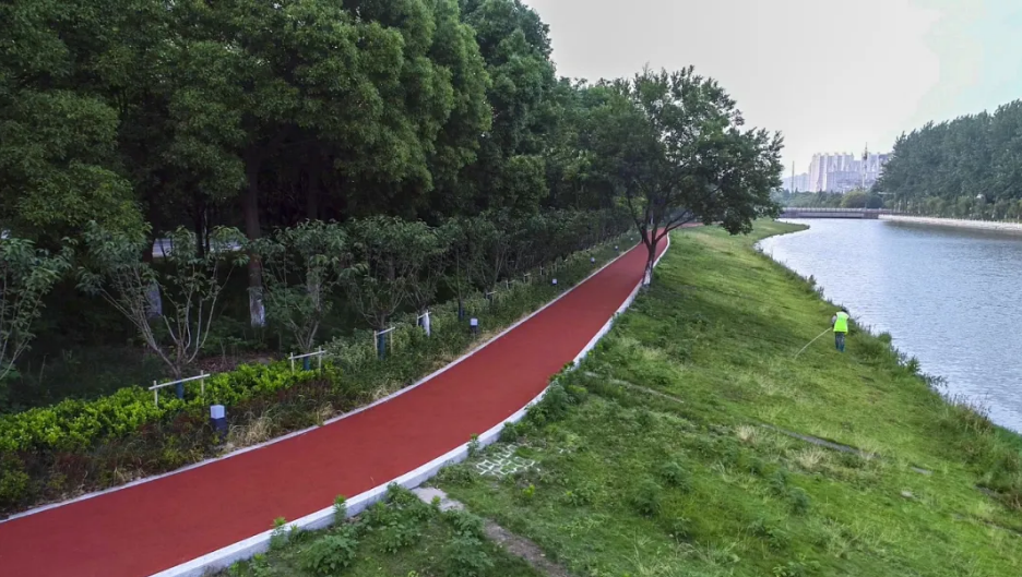 羌溪河城市公園慢行步道: 位于泰興市羌溪河西側、南接澄江路、北靠文昌路,占地面積約13.5萬平米。園內有一條環繞全園、長達2.5公里的慢行步道,步道寬3.9米,采用了彩色透水混凝土,步道沿線精心搭配了各類綠化品種,營造曲徑清幽、四季芳華的漫步體驗。