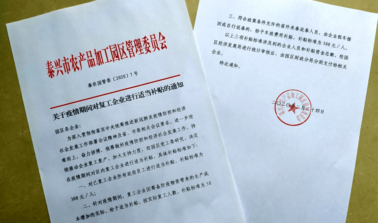 注入資金活水,促進企業復工達產 復工復產,資金是源頭活水。2月24日,泰興市農產品加工園區出臺文件,對35家生產性企業發放穩崗復產補貼,對所有返崗員工每人300元補貼企業;因籌備防疫物資帶來的生產成本,按實際復工人數每人50元補貼企業;對省外來泰返泰人員,由企業租車接回或自行返泰的,給予車旅費用補貼,每人500元補貼企業,園區累計已發放企業復工復產補助126萬元。“不僅補貼,郵政儲蓄銀行1000萬貸款,園區也協助轉貸,利息補貼20萬左右。”朱敏說,這些政策確保了企業140多名員工到崗復產。“今年一季度,園區幫助企業協調無本轉貸1.5億元,幫助江康藥業,新源倉儲等企業新增貸款1.9億元。有效緩解了企業發展資金壓力,提升了企業發展信心。”泰興市農產品加工園區管委會副主任杜建彬表示。
