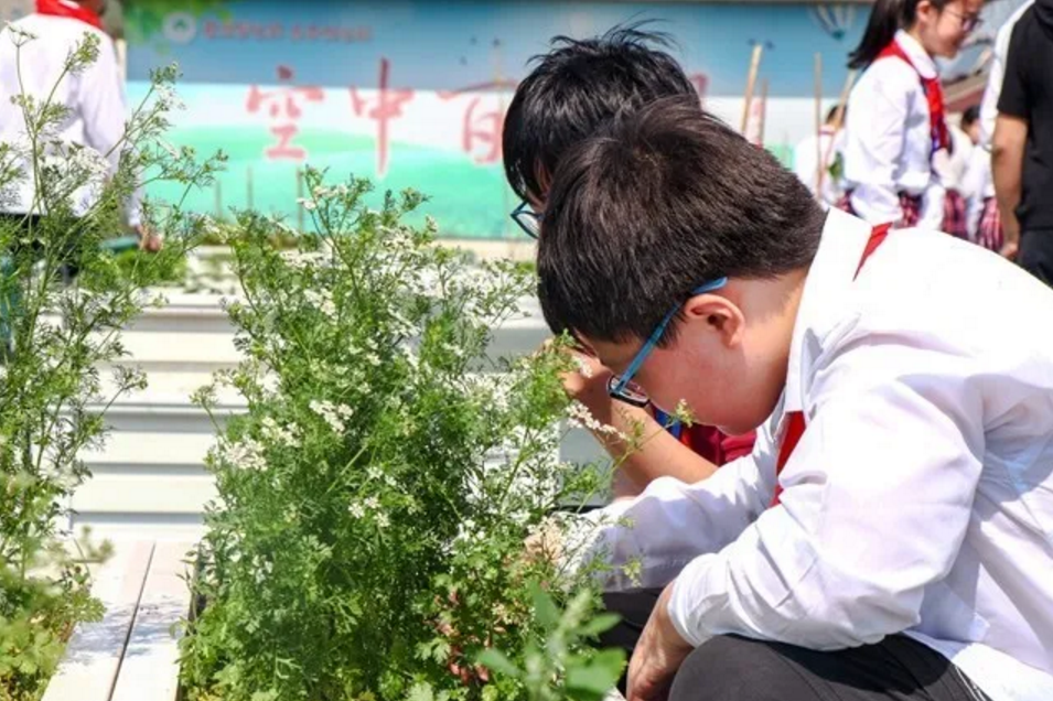 “不必說碧綠的菜畦,光滑的石井欄,高大的皂莢樹,紫紅的桑葚;也不必說鳴蟬在樹葉里長吟,肥胖的黃蜂伏在菜花上,輕捷的叫天子(云雀)忽然從草間直竄向云霄里去了……何首烏藤和木蓮藤纏絡(luò)著,木蓮有蓮房一般的果實(shí),何首烏有擁腫的根。”——魯迅《從百草園到三味書屋》風(fēng)景優(yōu)美、植物繁茂,還有各種可愛的小動物,這是魯迅先生筆下的百草園。這里裝著他兒時(shí)關(guān)于植物、關(guān)于草木的溫暖記憶。這里是他的童年樂園,也是他對家的懷念。 當(dāng)微風(fēng)拂過,紅的、綠的、黃的,各種植物迎風(fēng)招展,在陽光照耀下,茁壯成長。這是哪兒?定睛一看,這不是孩子們的“空中百草園”嘛。