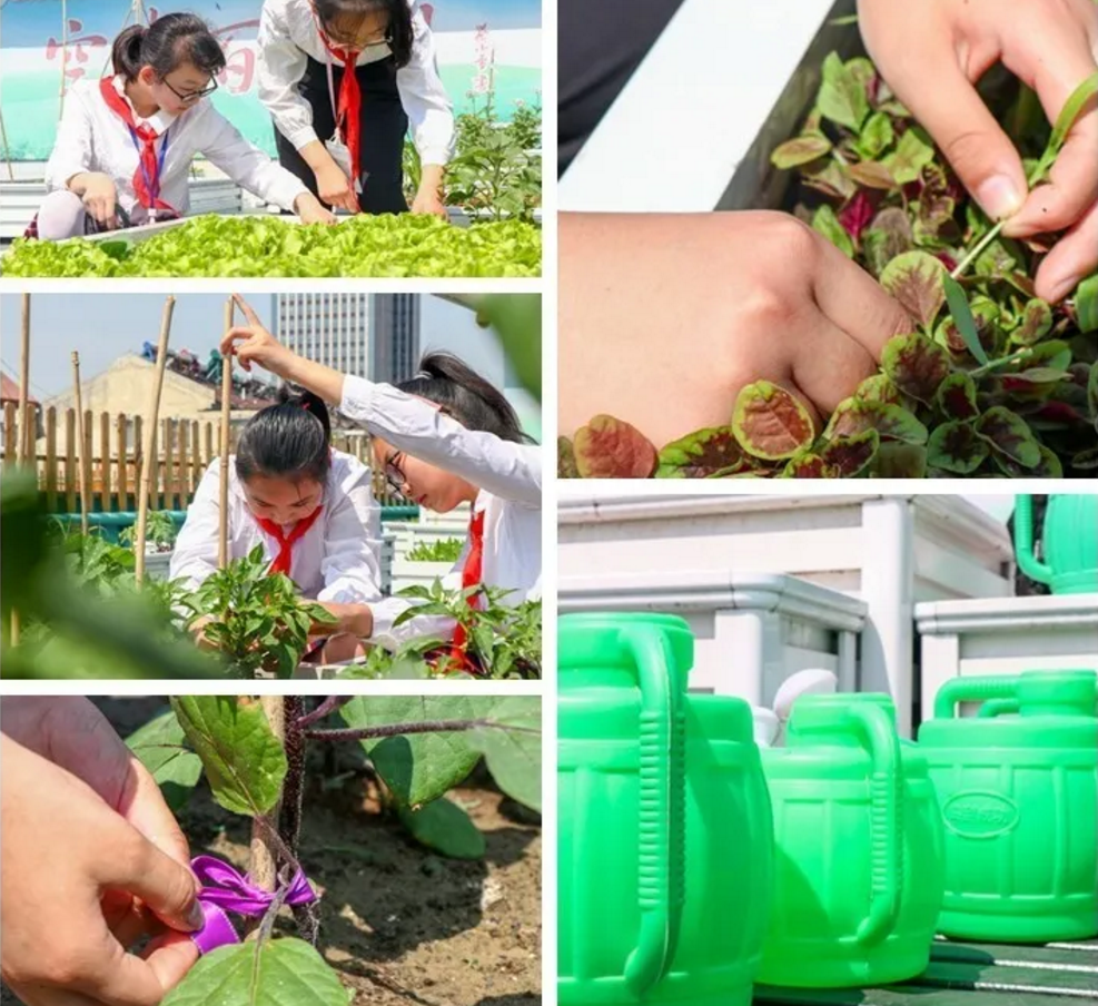 由于學(xué)校地處城區(qū),面積較小,為了讓孩子們更加貼近自然,體驗(yàn)勞動的樂趣,十年前,學(xué)校老師們集思廣益,在教學(xué)樓樓頂開辟了一塊實(shí)踐基地,將其命名為“空中百草園”。 時(shí)光荏苒,“空中百草園”已經(jīng)成了學(xué)校勞動教育培訓(xùn)基地,當(dāng)然,這里也成了每個(gè)附小學(xué)子記憶深刻的那塊樂土。