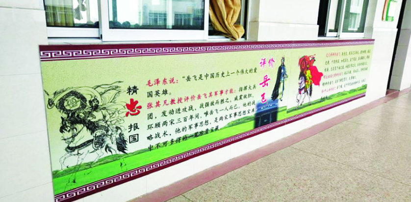 打造“岳飛魂”特色文化基地 通過物化,讓墻壁、教室、雕塑、長廊建設布置,將“岳飛魂”活靈活現(xiàn)、翔實可信地讓岳飛故事耳熟能詳,讓岳飛形象躍然眼前,讓岳飛精神撲面而來。學校精心構思,推進“四個一”環(huán)境建設。