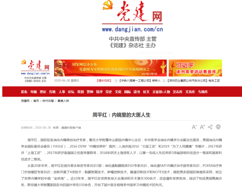 “周”式手術 2012年春節前夕,一位98歲高齡的老先生在子女的陪伴下來到中山醫院內鏡中心,他們是慕名前來找周平紅的。 周平紅運用內鏡進行一番探查后,終于找到了老先生多年進食后嘔吐的原因:賁門失弛緩征,賁門環狀肌出現痙攣,食物容易被痙攣收緊的賁門環狀肌堵在食管里,無法進入胃部。 POEM手術可根治賁門失弛緩征,還實現了“無切口、微創傷”的突破。這是周平紅的“絕活”,一般耗時只需30分鐘,創面不見一滴血,患者第二天可以照常飲食,第三天就出院回家了。 如今,中山醫院內鏡中心成為全國各地賁門失弛緩征患者的匯聚之地,遠至俄羅斯的患者也前來就診。患者年齡最大的103歲,最小的只有11個月。全世界5000例POEM手術,周平紅團隊做了一半! 其實,POEM的手術方法來源于另一項內鏡手術——內鏡黏膜下剝離術(ESD),這項國際尖端技術也是由周平紅首先引進并在國內推廣的。 不甘平庸 周平紅回顧自己成長的過程,總結出兩點:一是腦子不笨;二是不甘平庸,敢嘗試。 他是在泰興農村長大的。中學讀了7年,中考考數學時,借了親戚一塊手表,當時沒見過手表,考試中一調,就把時間調錯了。再重新讀,就考全年級第一了。1986年高考,泰興東半縣第二名。 1992年大學畢業分到中山醫院普外科,那時不是天天開刀,有時上午開刀,下午就睡覺。“浪費”了兩年,想,這樣下去不對了,就要求去內鏡科做內鏡,多掌握一門技術。 2006年,他再赴日本學習消化道早癌微創切除新技術,回來不顧反對就開始嘗試;那時日本的奧林巴斯器械國內還沒有,他就自制,找工人用老虎鉗把針刀的刀頭彎成鐮刀狀。 他還創造性地開展了一系列微創治療新方法,其中包括在國內率先開展的胃腸道早癌和癌前病變序貫篩查,以及內鏡黏膜下剝離術治療。 前幾年,他到德國去做手術,一個18歲小姑娘被發現胃部有一腫塊。他原本想為她做內鏡下全層切除,但術中德國醫生連連說“stop”,擔心穿孔,不讓他做。無奈,只能配合德國外科醫生行剖腹手術,把小姑娘的胃切掉三分之二。 切下來后,他將標本剖開看,發現“瘤”長得很深,認為是“異位胰腺”,并列舉了5個理由。但站在身后的幾國醫生都不相信,堅持認為是間質瘤。 回國路上,他垂頭喪氣——“一個內鏡手術變成了外科手術”!但幾天后就收到了大會主席的郵件——“祝賀您!周教授,您是全世界為數不多能夠診斷異位胰腺的人。”周平紅回復:“不,中山醫院內鏡中心的任何醫生都能診斷。”他還是有點遺憾,小姑娘的胃切掉三分之二,容易營養不良。