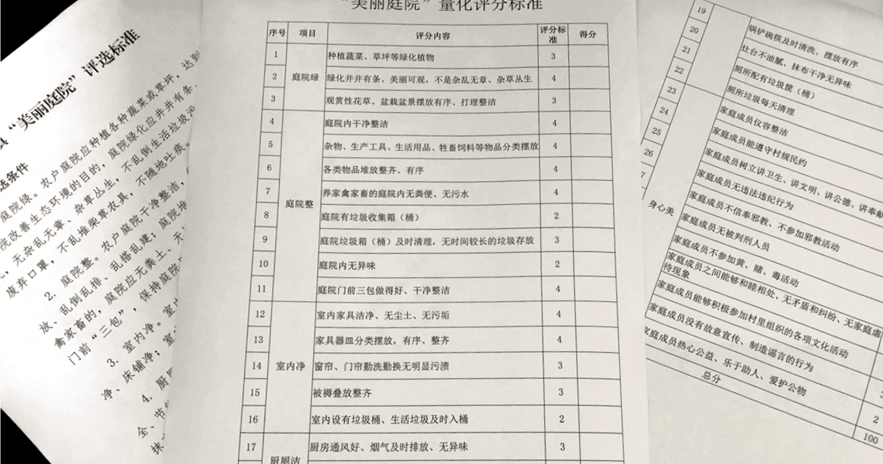 一份測評表 本著“量化、客觀、公正”的原則,“美麗庭院”以農戶為單位,將“美麗庭院”創建分為五項量化要素:庭院綠、庭院整、室內凈、廚廁潔、身心美,實行計分評比。最終根據積分高低確定名單,并對“美麗庭院”的農戶進行掛牌及物質獎勵。明確、細化評選要素,不僅便于評選公正,更加利于農戶對照標準進行整改,豐富庭院、美麗生活。