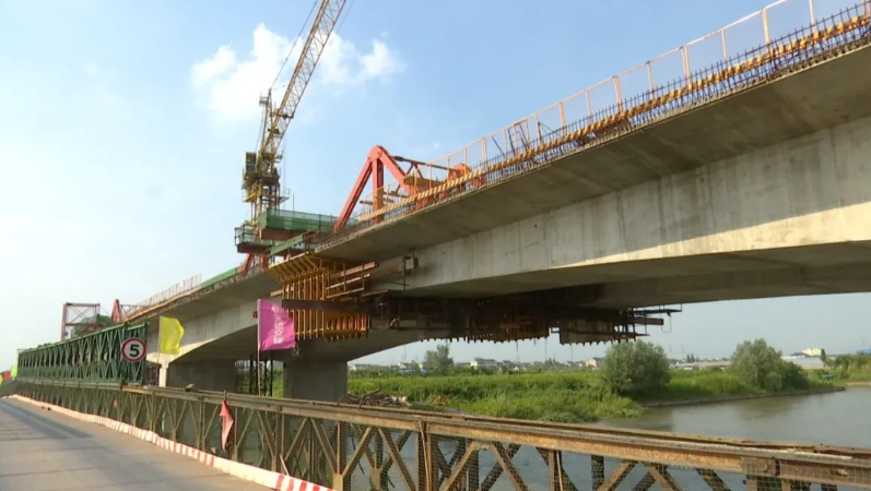 為加快工程進度,施工單位投入了100多臺機械、300多名施工人員,分12個工段,加緊施工。目前,該工程路基施工完成,路面水穩基層完成約60%,如泰運河大橋現澆及懸澆施工正緊張有序推進。