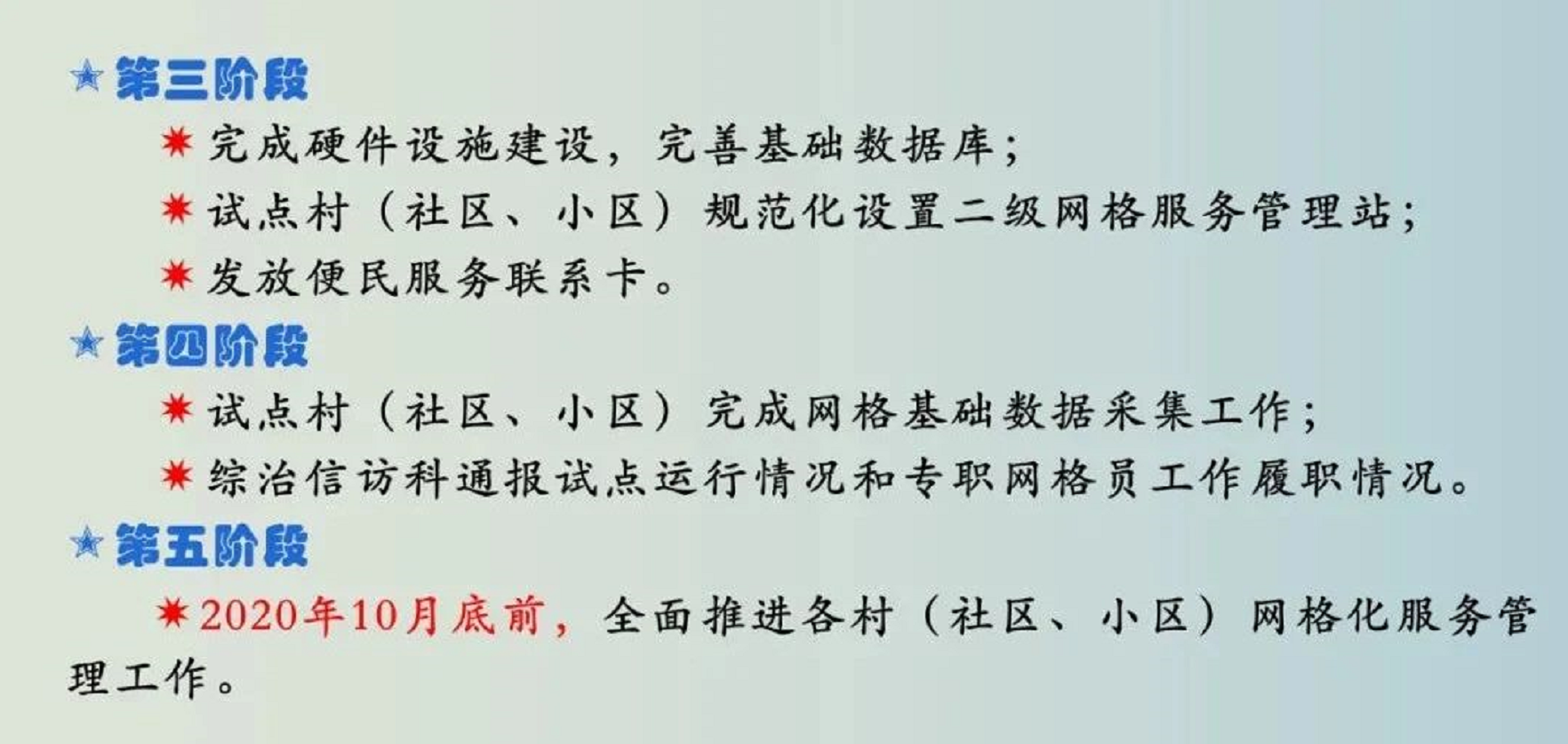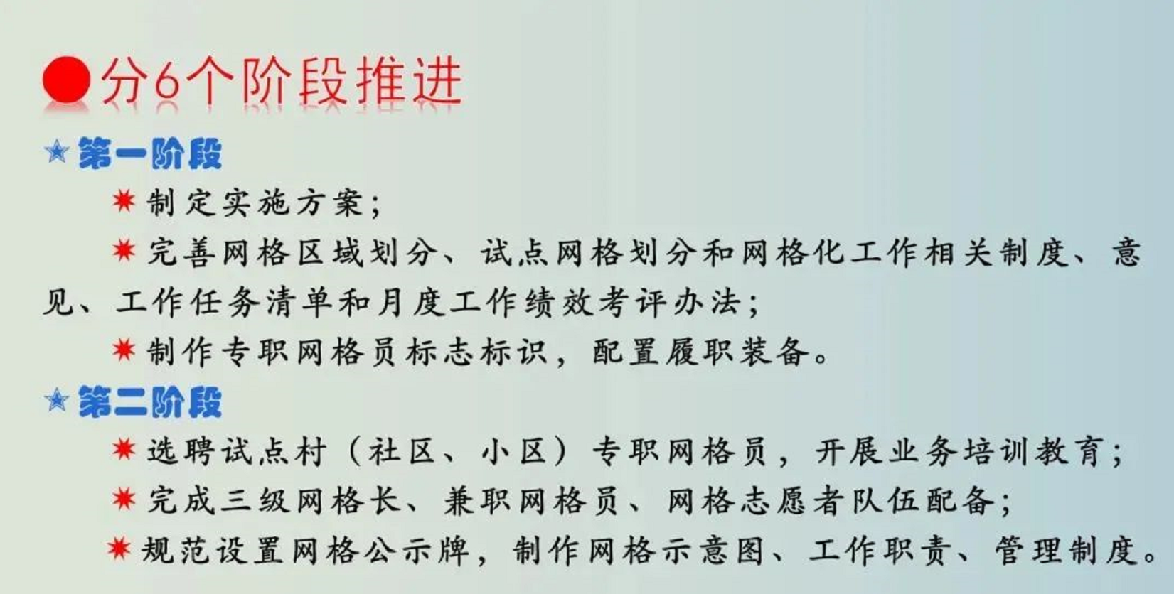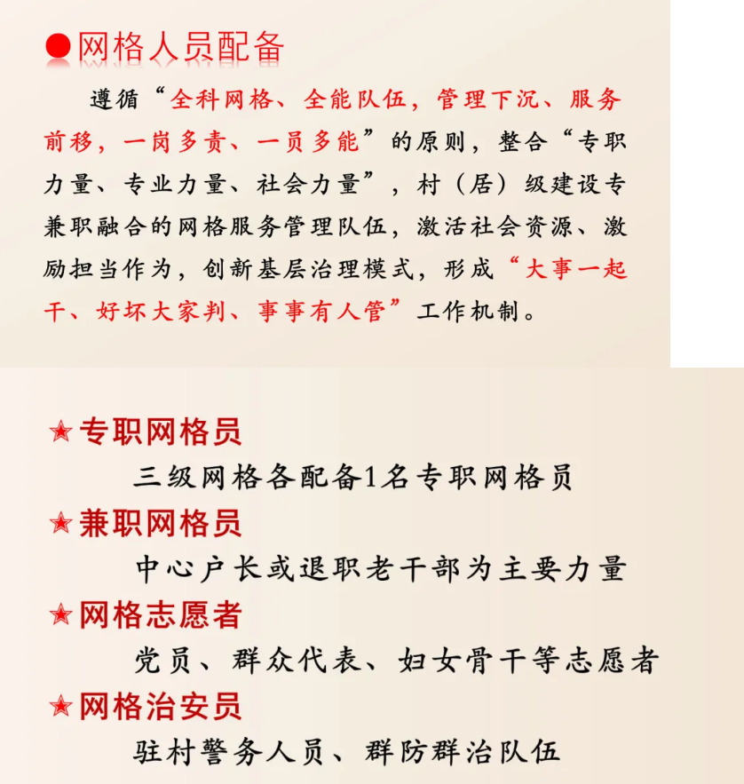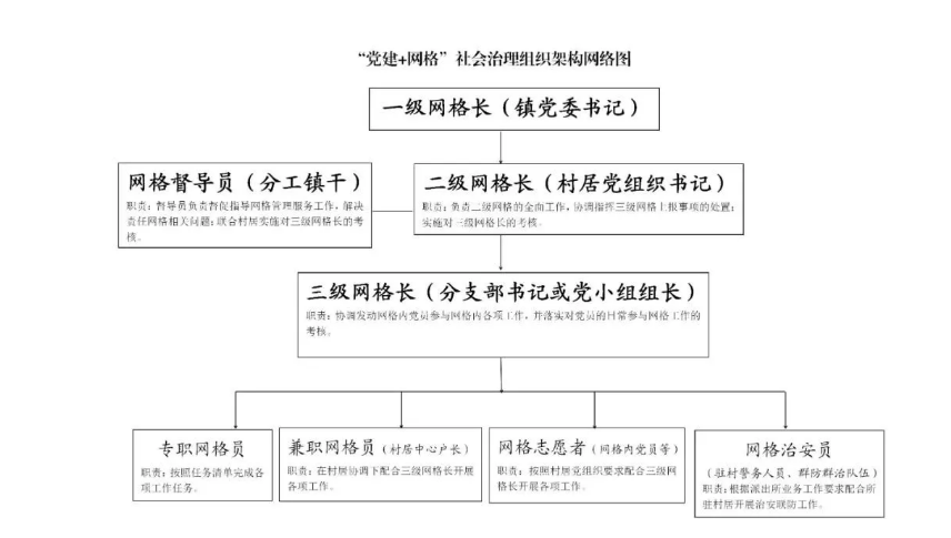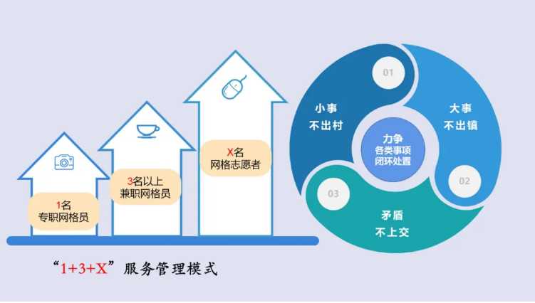 加強專兼職網(wǎng)格員隊伍建設,構(gòu)建“1+3+X”服務管理模式(1名專職網(wǎng)格員、3名以上兼職網(wǎng)格員、X名網(wǎng)格志愿者);健全網(wǎng)格化責任落實機制,制定網(wǎng)格管理責任清單,推行定位管理、節(jié)點管理,強化績效管理,不斷提高網(wǎng)格化運行機制的規(guī)范化水平。力爭各類事件在村(社區(qū)、小區(qū))級網(wǎng)格實現(xiàn)閉環(huán)處置,進而實現(xiàn)“小事不出村、大事不出鎮(zhèn)、矛盾不上交”。