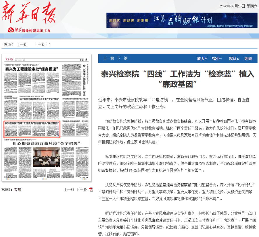 《新華日報》報道泰興市檢察院“四線”工作法,如何為“檢察藍”植入“廉政基因”?