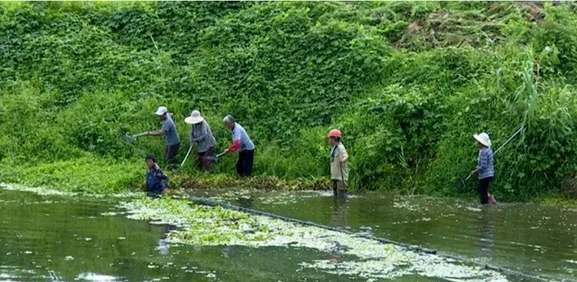 “這兩天河里的水葫蘆長得特別快,我們倆每天打撈的任務(wù)很重,為了避開高溫,我們早上天剛亮就出來了。”昨天上午8點半,記者在河失鎮(zhèn)躍進(jìn)中溝采訪中,打撈員蔡亞飛、張仁賢告訴記者,他們已經(jīng)工作近3個小時了。