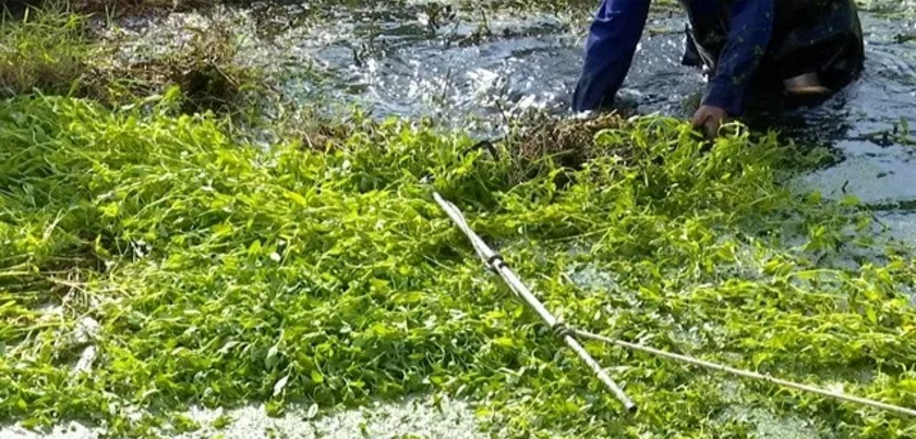 蔡亞飛、張仁賢的作業(yè)小船上沒有遮陽設(shè)備,他們戴著一頂草帽,小船在河面上緩緩前行,看到水面上漂浮著的水生植物,就停下來用網(wǎng)打撈。汗水不斷地從毛孔里滲出,他們早已汗流浹背。