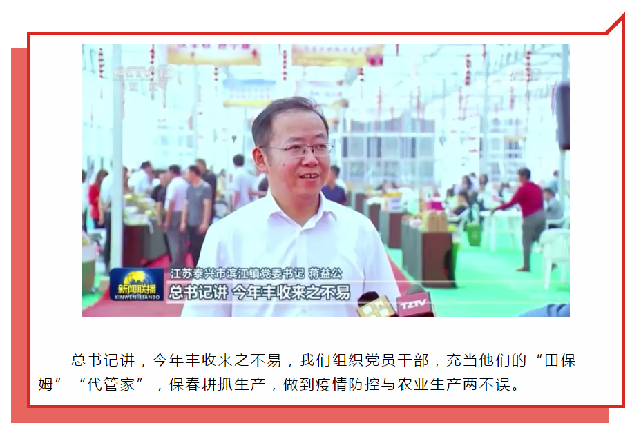 泰興市濱江鎮黨委書記蔣益公在智能玻璃大棚里接受采訪,他這樣告訴全國人民: “總書記講,今年豐收來之不易,我們組織黨員干部,充當他們的“田保姆”“代管家”,保春耕抓生產,做到疫情防控與農業生產兩不誤。”