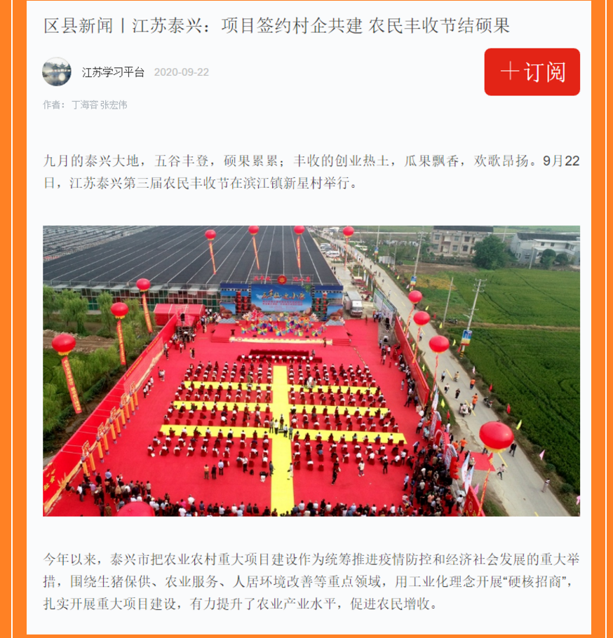 9月22日《新聞聯播》聚焦泰興第三屆農民豐收節,泰興用大數據物聯網智控等技術,為農田管護保駕護航。