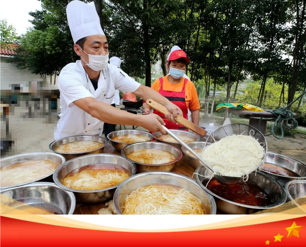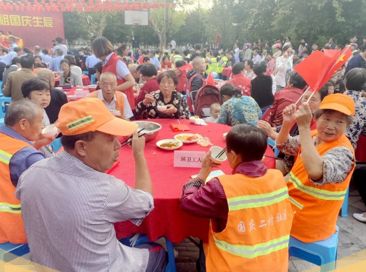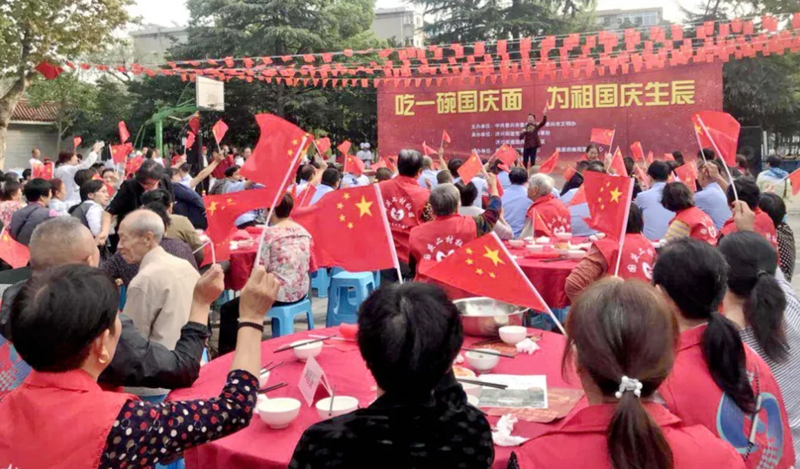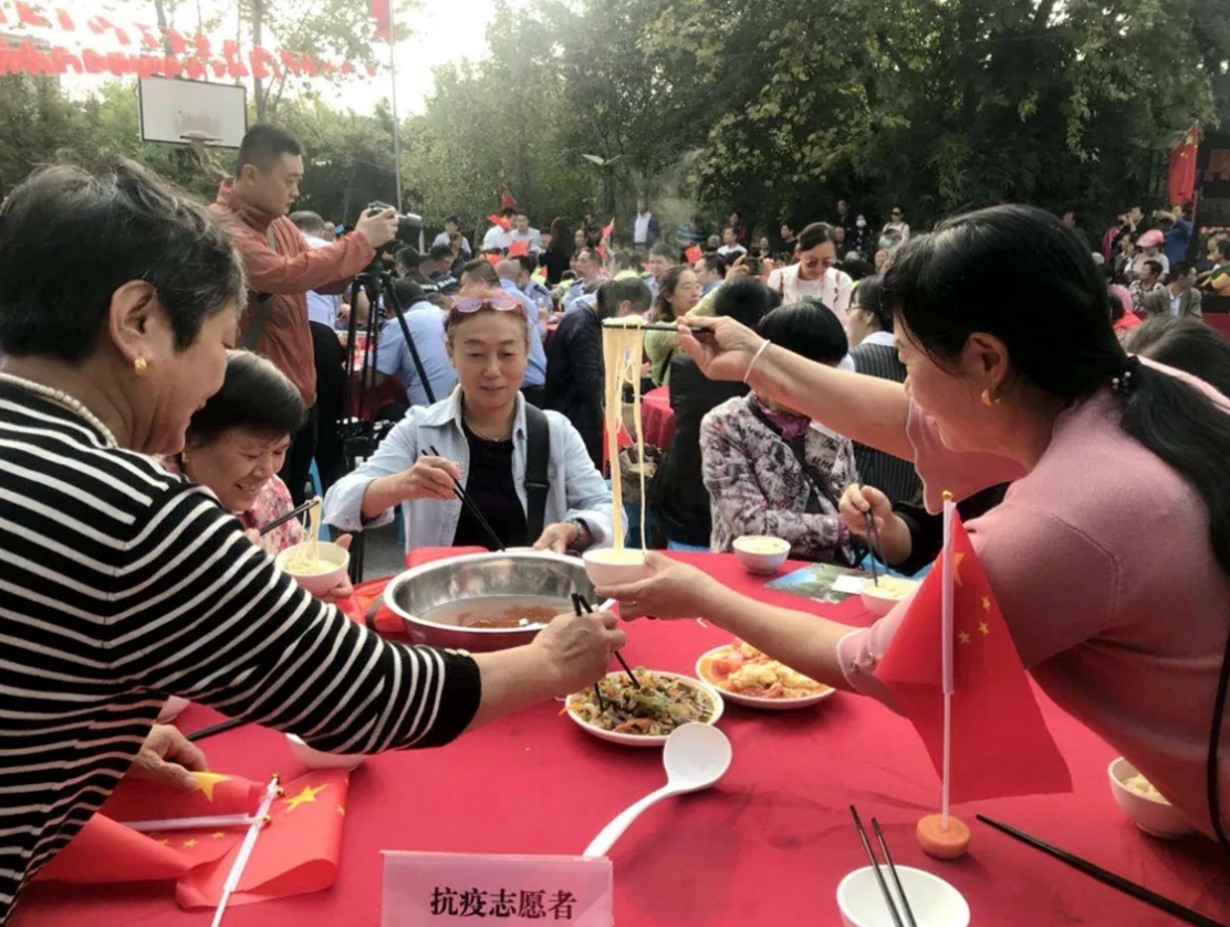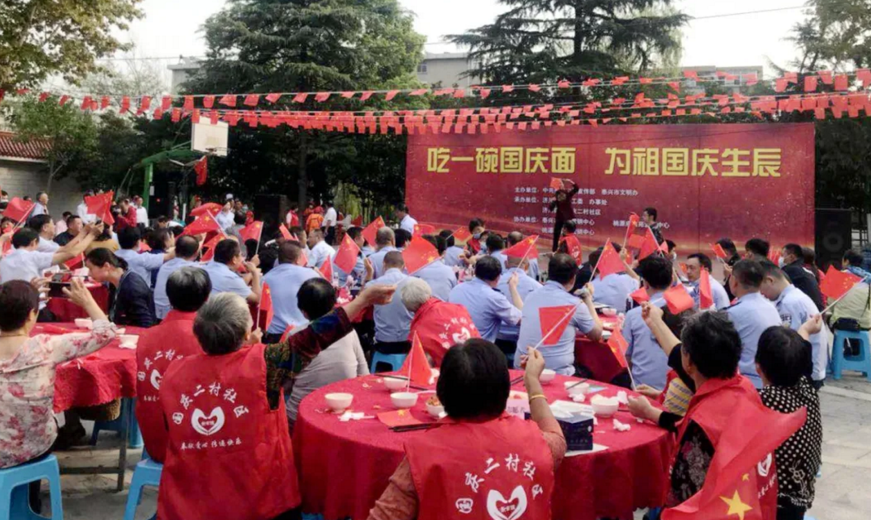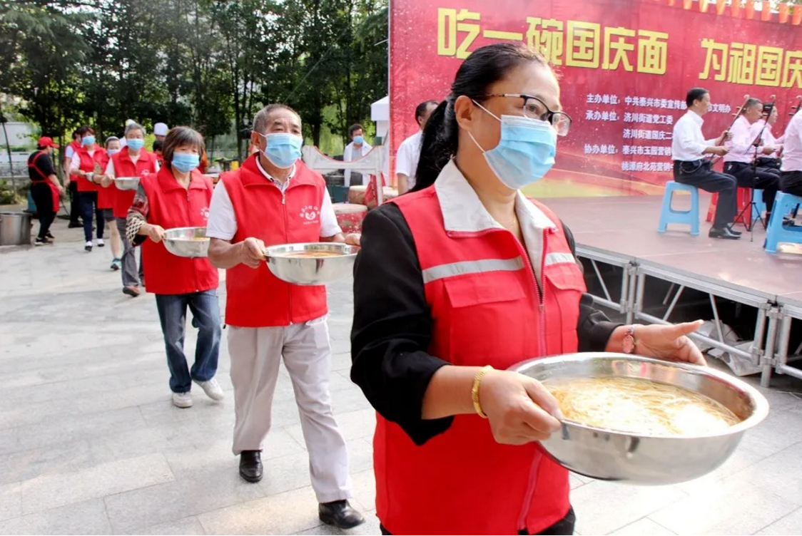 喜迎國慶,舉國同慶,今天,你吃“國慶面”了嗎?在中華人民共和國成立71周年之際,泰興市委宣傳部、文明辦、濟川街道、國慶二村社區(qū)、邀請市民同吃一碗“國慶面”。社區(qū)居民、醫(yī)護人員、人民教師、退伍軍人、環(huán)衛(wèi)工人、抗疫志愿者……來自各行各業(yè)的400多人,歡聚一堂,用同吃“一碗面”,這一最生活化的表達方式,為祖國母親慶祝生日。