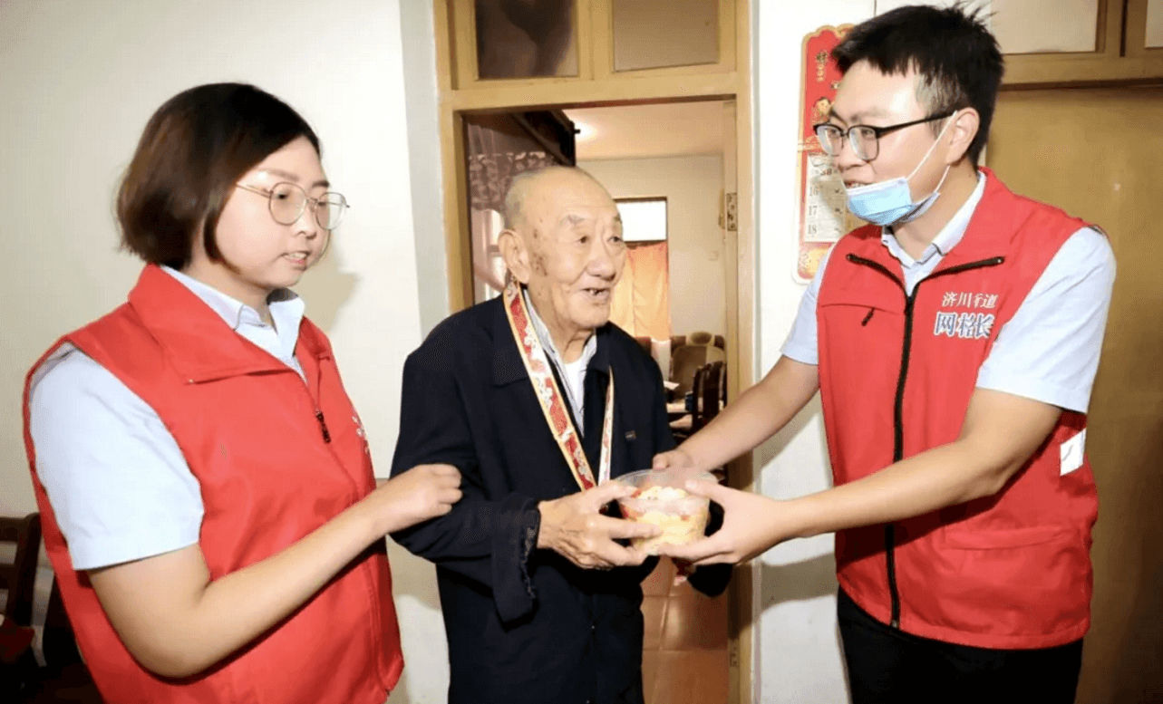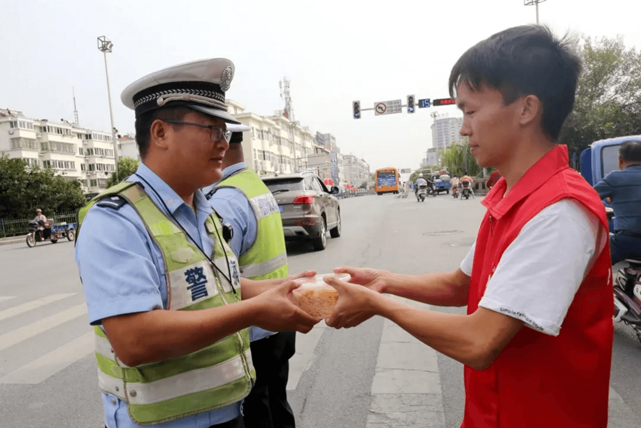 除了現(xiàn)場吃“團圓面”,社區(qū)志愿者們,將“長壽面”送到抗戰(zhàn)老兵家中,將“奮進面”送給執(zhí)勤交警,以表達敬意,共迎國慶。