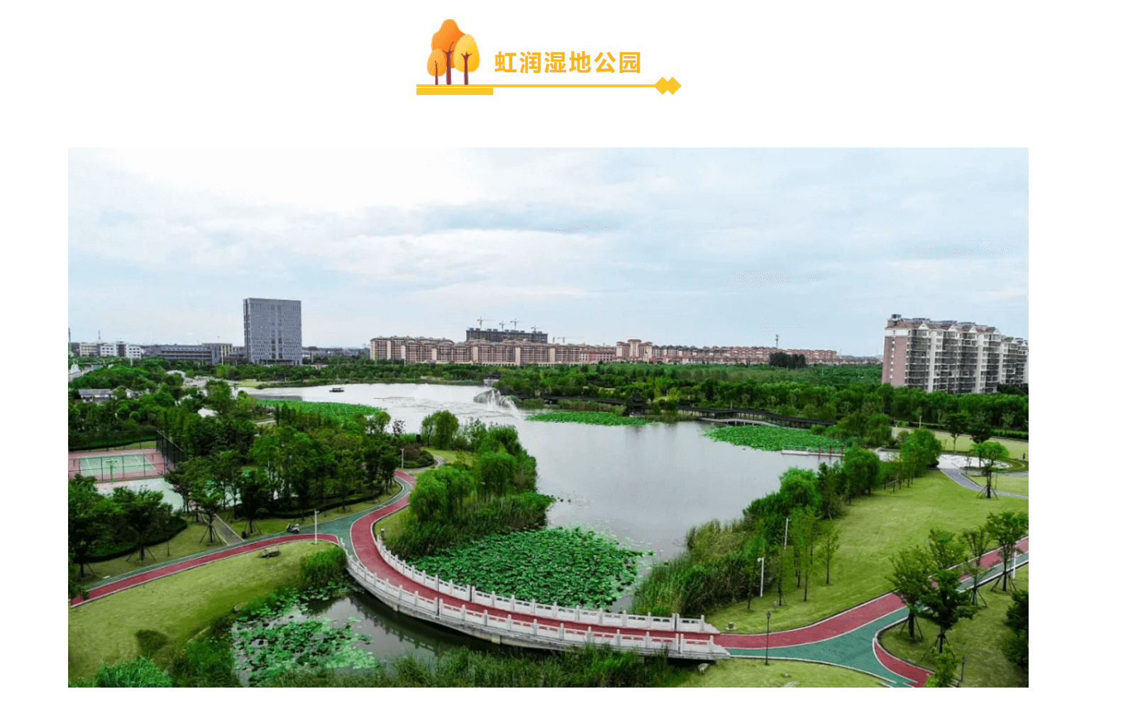 虹潤濕地公園建設了人工湖、親水平臺、生態水岸以及運動休閑等設施,形成水景觀賞區、親水區、文化娛樂休閑區、游樂健身區和運動區等五大功能板塊。