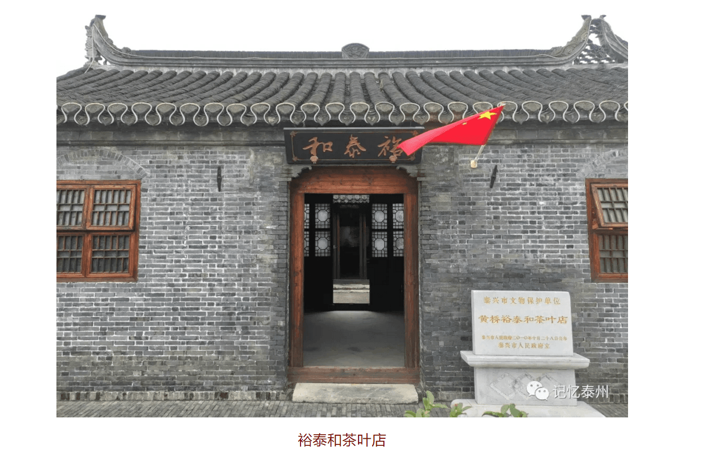 黃橋鎮東進路,是一條橫穿老鎮區的主街道,曾是如(皋)泰(興)官道的鎮區段。這條路自東向西由處于同一條直線上的口巷、東大街、西大街、西街組成。東大街是老黃橋最繁華的商業街之一,歷史上的東大街僅有250 米長、3-4 米寬,卻集中了50多家布店、煙店、茶葉店、雜貨店、廣貨店、藥鋪、當鋪、書鋪。這條街上曾經有許多百年老字號,雖然商號已經消失,但這些商家的傳奇故事仍流傳不絕。仁源生藥店研制的蟾酥曾于1915年獲萬國博覽會銅獎,裕泰和茶葉店曾創出享譽蘇北地區的品牌。東進路經過多次拓寬改造,已經成為一條現代商業街,但是轉入小巷,就是傳承歷史的巷道、民居,歷史與現代相融于沿街一排店面房。裕泰和茶葉店位于東進路南側,安徽績溪人胡沇源創辦于1876年,三間四進,前店后坊。