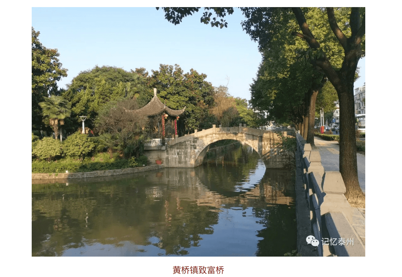 臨水而建的黃橋自然少不了橋。文明橋,原名南壩橋,為單孔石橋,原來位于如泰運河之上。曾數度重修,1979年,如泰運河拓浚,橋被拆除。2002年,直來河上原樣復建文明橋,老橋的部分構件置于新橋身。致富橋,原名知府橋,建于明朝,是從東邊進出黃橋的關口。1940年黃橋決戰期間,東郊是主戰場,大量的支前物資和黃橋燒餅就是經由此橋運往前線。20世紀90年代,東進路擴建,致富橋北移20米重建。后來進行街道整治,再北移100多米重建,致富橋直通黃橋公園。