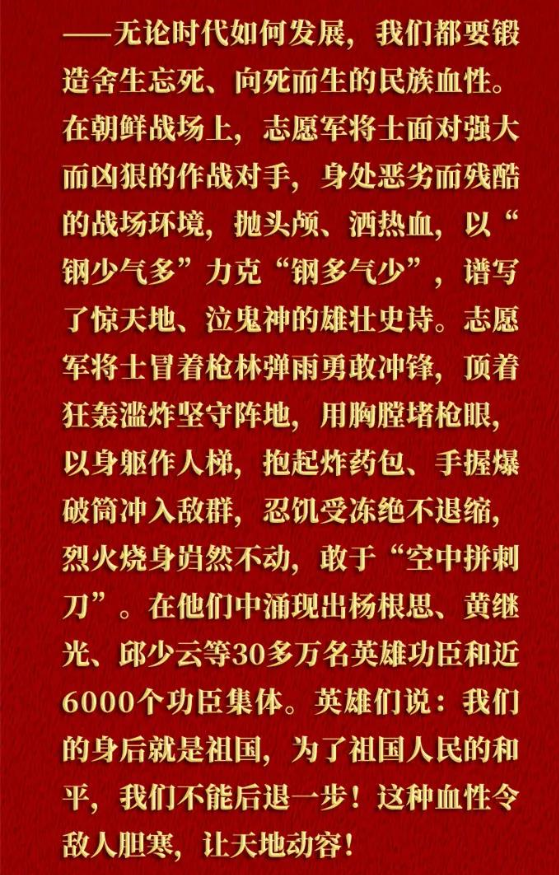 上午10點,紀念中國人民志愿軍抗美援朝出國作戰70周年大會在北京人民大會堂隆重舉行,習近平總書記出席大會并發表重要講話。在講到“鍛造舍生忘死、向死而生的民族血性”時,習近平總書記說:志愿軍將士中涌現出楊根思、黃繼光、邱少云等30多萬名英雄功臣和近6000個功臣集體。