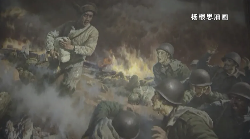 大批敵人已快要涌上山頭,楊根思抱著炸藥包,踏著美陸戰一師的軍旗,沖入敵群。一聲巨響,敵人粉身變泥土,英雄輝煌化金星! |