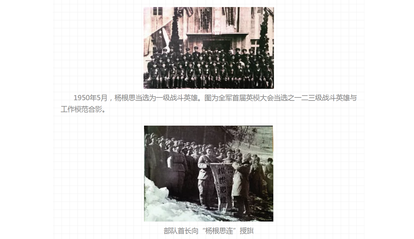“有我在,陣地就不會丟!” 1950年6月,美帝國主義悍然發動侵朝戰爭,10月,美國侵略軍越過三八線,逼近鴨綠江邊,炮轟我國沿江村莊,把戰火燒到我國邊境。毛主席號召全國人民“抗美援朝,保家衛國”。10月25日,中國人民志愿軍雄赳赳、氣昂昂,跨過鴨綠江,同朝鮮人民并肩作戰,共同打擊美國侵略者。11月7日,楊根思隨部隊入朝。沿途上,楊根思看到美國侵略者在朝鮮犯下的滔天罪行,恨不得一仗把美國強盜全部消滅光。 首批入朝志愿軍與朝鮮人民軍并肩作戰,把敵人趕到清川江以南,贏得了第一次戰役的輝煌勝利。美國侵略軍頭子麥克阿瑟重新集結20萬兵力,分東西兩線,氣勢洶洶地向鴨綠江撲來,妄圖挽回敗局,叫嚷:“圣誕節前結束朝鮮戰爭。” 為粉碎敵人的狂妄野心,中朝人民軍隊于11月25日起發起第二次戰役,從東西兩線同時向敵人發起進攻。楊根思所在部隊奉命開往東線長津湖地區,對敵人實施分割圍殲。部隊冒嚴寒,頂風雪,翻冰山,越雪嶺,一夜行軍 100 多里,直插下碣隅里。 分割圍殲戰打響了。兄弟部隊一連拿下了好幾個山頭。楊根思他們作為第二梯隊,還待在下碣隅里東邊的山溝里待命。根據全連戰士的要求,楊根思幾次前往營部請戰,要求把最艱巨的任務交給三連。 營長攤開地圖,指著1071高地(又名飛鶴山)東南屏障小高嶺說:“你們的任務是守住小高嶺,切斷敵人退路,保證圍殲美陸戰一師。”楊根思堅定地說:“堅決完成任務!保證人在陣地在,決不讓敵人爬上小高嶺半步!”