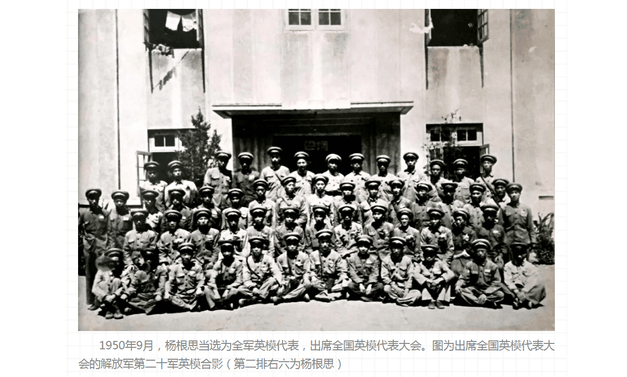 1950年春,全軍掀起了“學習文化”的熱潮。那時,楊根思所在部隊住在吳淞進行海上練兵。不管白天練兵多么疲勞,楊根思每天夜里總要堅持學習。他說:“不學好文化,就學不好革命的理論,學不好現代軍事科學。我要像打仗一樣炸開新的‘碉堡’。” 一天,他坐在一盞小煤油燈下學習,由于過度疲勞,帽沿被燒著了也不知道。團的《先鋒報》刊登了《楊根思學文化》的報道。師長在軍人大會上表揚了楊根思刻苦學習的精神,贊譽楊根思為全師的學習標兵。” 5月,楊根思參加了軍首屆英模大會。在這屆英模大會上,楊根思被評為一級戰斗英雄。隨后又提升為連長。1950年,他還被選為出席全國英模代表大會的代表,9月26日,楊根思和800多名戰斗英雄、勞動模范受到了毛主席和朱總司令的接見。