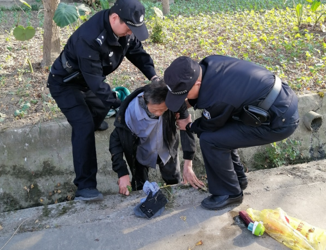 接到報警后,值班民警殷培生,輔警何承華、呂家暉迅速趕到現場,看到一老人臥倒在路邊水渠,衣褲濕透且全身顫抖,旁邊散落了一地的隨身物品。
