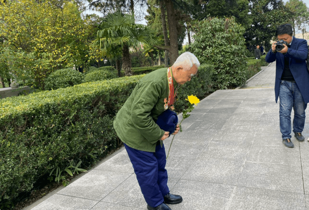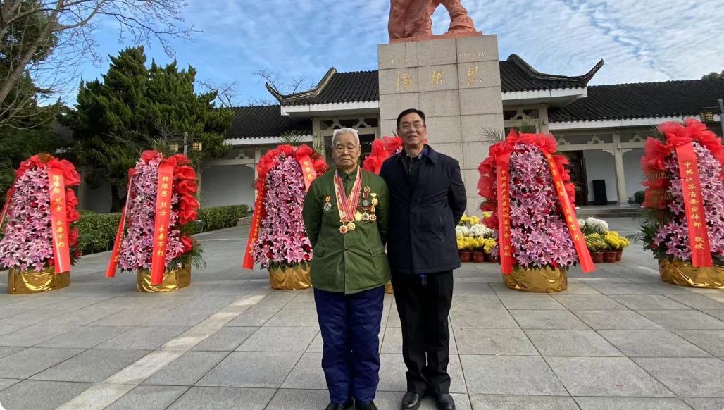 抗美援朝老戰(zhàn)士楊德盛為楊根思獻(xiàn)花 入冬后的泰興,楊根思烈士陵園里,抗美援朝老戰(zhàn)士楊德盛握著手里的黃菊靜靜佇立,耄耋之年的他望著石柱上用堅(jiān)毅與勇敢鑄就的塑像,回憶他一生中心碎的一刻:“老連長(zhǎng)犧牲時(shí),我離他只有100米,遠(yuǎn)遠(yuǎn)地就看到了火光……”這些年,楊德盛時(shí)常做夢(mèng),夢(mèng)到老連長(zhǎng),一如那聲用生命和鮮血拉響的炮火,在他此后人生里,回響了70年。 楊德盛與兒子楊根寶 從成都到泰興,楊德盛的身體難以負(fù)荷遙遠(yuǎn)路途。兒子楊根寶說(shuō):“月初父親接到參加楊根思烈士犧牲70周年活動(dòng)的邀請(qǐng)后,提前半個(gè)月鍛煉身體,只為了能適應(yīng)長(zhǎng)途飛行。”