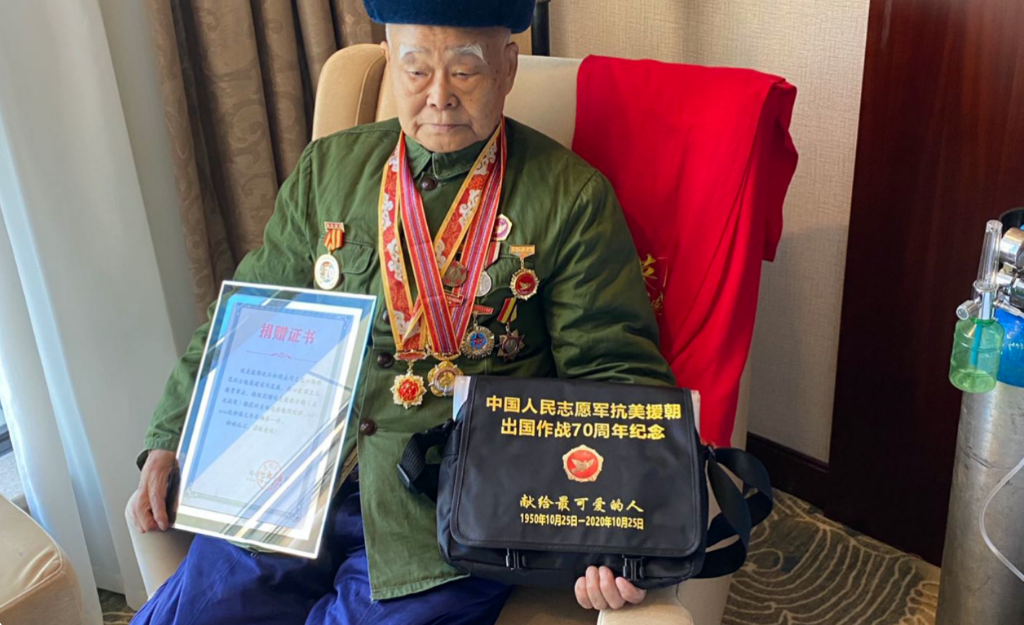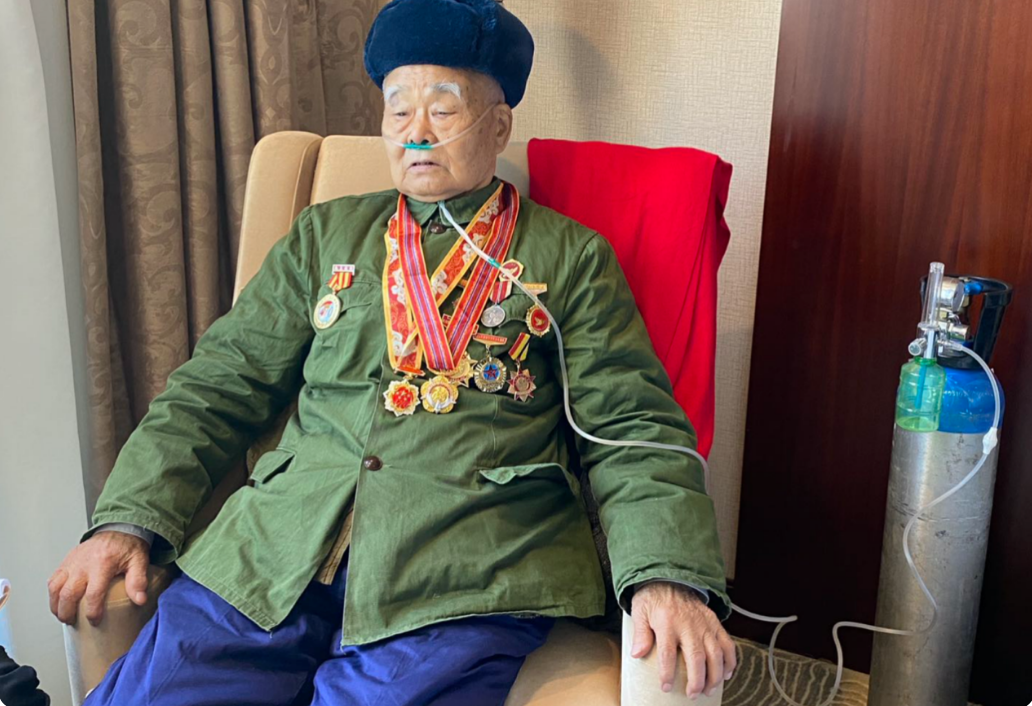楊德盛身體不適 堅(jiān)持接受采訪 楊德盛一邊吸著氧氣,一邊回憶當(dāng)年情景。“我和老連長(zhǎng),還有王大群,都是江蘇老鄉(xiāng)。我們?cè)趹?zhàn)場(chǎng)上約定,如果誰(shuí)犧牲了,活著的人回家鄉(xiāng),要去看望犧牲戰(zhàn)友的家人。”那時(shí)參軍還未滿一年的楊德盛,和這位同鄉(xiāng)大哥走得很近。 “老連長(zhǎng)叮囑過(guò)我,‘戰(zhàn)場(chǎng)上別給我丟臉,別當(dāng)孬種啊’。”楊德盛沒(méi)想到,這是楊根思留給他的最后一句話。 1950年11月,美國(guó)第10軍和第8集團(tuán)軍成東西二線,以鉗形攻勢(shì)向鴨綠江全線逼進(jìn)。中國(guó)人民志愿軍第九兵團(tuán)負(fù)責(zé)潛入東線,在長(zhǎng)津湖地區(qū)誘敵深入,尋找機(jī)會(huì)全殲敵軍。當(dāng)時(shí),楊根思帶領(lǐng)的20軍58師172團(tuán)1營(yíng)3連接到任務(wù),前往尚未完全包圍的下碣隅里截?cái)嗝儡娡寺贰?連冒著零下三四十度的惡劣天氣,翻過(guò)重重寒嶺,于29日凌晨來(lái)到了下碣里東南的1071高地。 天剛亮,十幾架敵機(jī)便開始對(duì)陣地輪番轟炸,接連9次的瘋狂進(jìn)攻,讓這里成為了長(zhǎng)津湖最激烈的戰(zhàn)場(chǎng)之一。“我趴在雪地里被敵軍發(fā)現(xiàn),腿部中彈,下腹被捅了一刀。”楊德盛回憶,在敵人第9次進(jìn)攻之前,楊根思下達(dá)了重傷員撤離的指令,“是王大群把我背下陣地,戰(zhàn)場(chǎng)上只剩下老連長(zhǎng)一個(gè)人。”孤身留在戰(zhàn)場(chǎng)的楊根思不顧一切,搜集所有武器和炸藥埋伏在高地上。40多個(gè)美國(guó)士兵一沖而上時(shí),他抱起炸藥包,拉響導(dǎo)火索,在一聲巨響中與敵人同歸于盡。 之后,楊德盛回國(guó)治療,后再返朝鮮繼續(xù)作戰(zhàn)。1951年5月,他所在的部隊(duì)過(guò)了三八線,向南進(jìn)發(fā)。“當(dāng)時(shí)離漢城只有40里路,站在山上能望見城里的燈,但接到了緊急撤回的命令。”抗美援朝五次戰(zhàn)役中,楊德盛撿回兩顆迫擊炮照明彈和一個(gè)炸藥桶,這些戰(zhàn)爭(zhēng)的見證和軍功章一道被楊德盛珍藏。