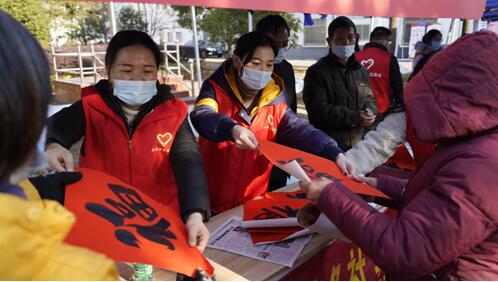 送春聯(lián)攤位上,文聯(lián)志愿者現(xiàn)場(chǎng)揮毫潑墨,為廣大居民送上最真摯的新年祝福。現(xiàn)場(chǎng)所寫的春聯(lián)、福字吸引了很多居民駐足觀看,爭(zhēng)相邀請(qǐng)志愿者為自己寫上一個(gè)“福”。“馬上要過年了,福字貼在門上,紅紅火火。”拿到“福”字的秦老太笑得合不攏嘴。