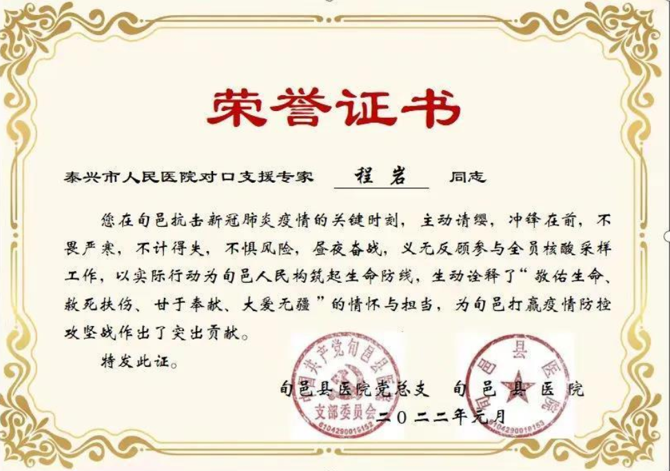 “敬佑生命、救死扶傷、甘于奉獻、大愛無疆”這張榮譽證書,是對遠在陜西省咸陽市旬邑縣的程巖醫(yī)生最好的肯定和褒獎。2021年7月,作為泰興赴旬支醫(yī)組組長,泰興市人民醫(yī)院眼科副主任醫(yī)師程巖來到陜西旬邑縣醫(yī)院開始為期1年的對口支援工作。 從事眼科工作30余年,程巖深知眼科疾病患者的痛楚,同時已經有過一次援疆經歷的他,也清楚,旬邑縣眼科相對于其他科室,人才培養(yǎng)、各類手術的開展相對薄弱,亟需“補課”。“這里的群眾,出一趟遠門看眼病很不容易,大量眼病患者只能去上一級醫(yī)院治療。我要做的工作很多,任務艱巨,責任重大,使命光榮。”剛到旬邑,程巖就給自己的支援工作定了目標。