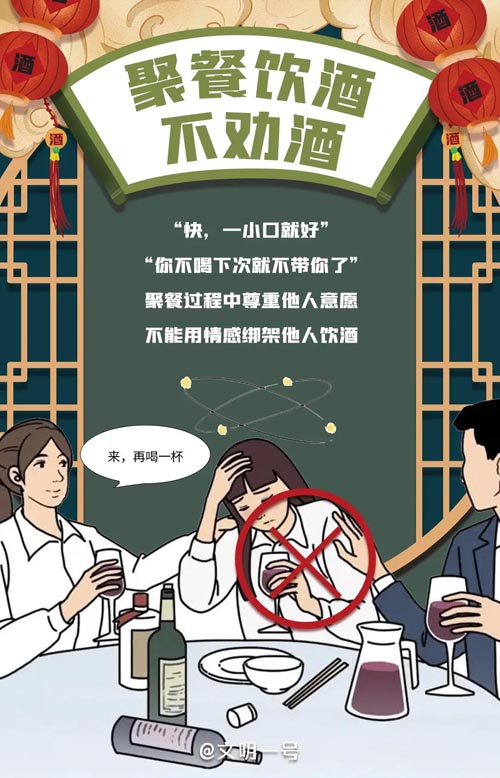 無論是平日聚餐 還是佳節(jié)團(tuán)圓 都不能將感情綁架在“酒杯上” 感情深不深不由“酒量多少來決定” 給不給面子也不在于“喝不喝這杯酒” 鼓勵文明聚餐、文明飲酒 別讓人受折磨、身體有負(fù)擔(dān) 來源:文明一號 |