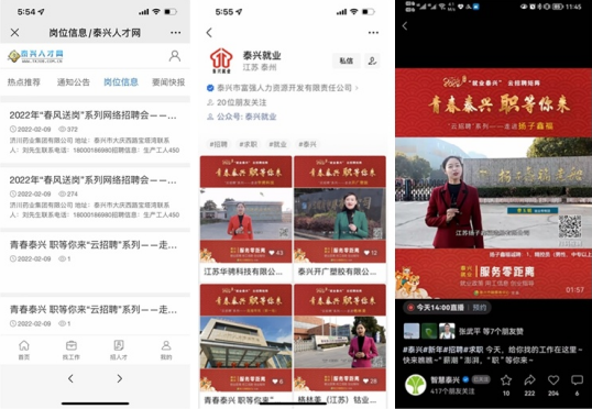 從1月31日開始,泰興2022年“春風送崗”系列網絡招聘活動矩陣式鋪開。打開電視,重點骨干企業招聘用工宣傳片,特別亮眼;翻開報紙,崗位招聘信息,分門別類;搜索網絡,“泰興人才網”招聘專區,映入眼簾;點擊微信,“泰興就業”小程序,刊發動態崗位信息;“智慧泰興”視頻號,“青春泰興·職等你來”直播帶崗“面對面”……