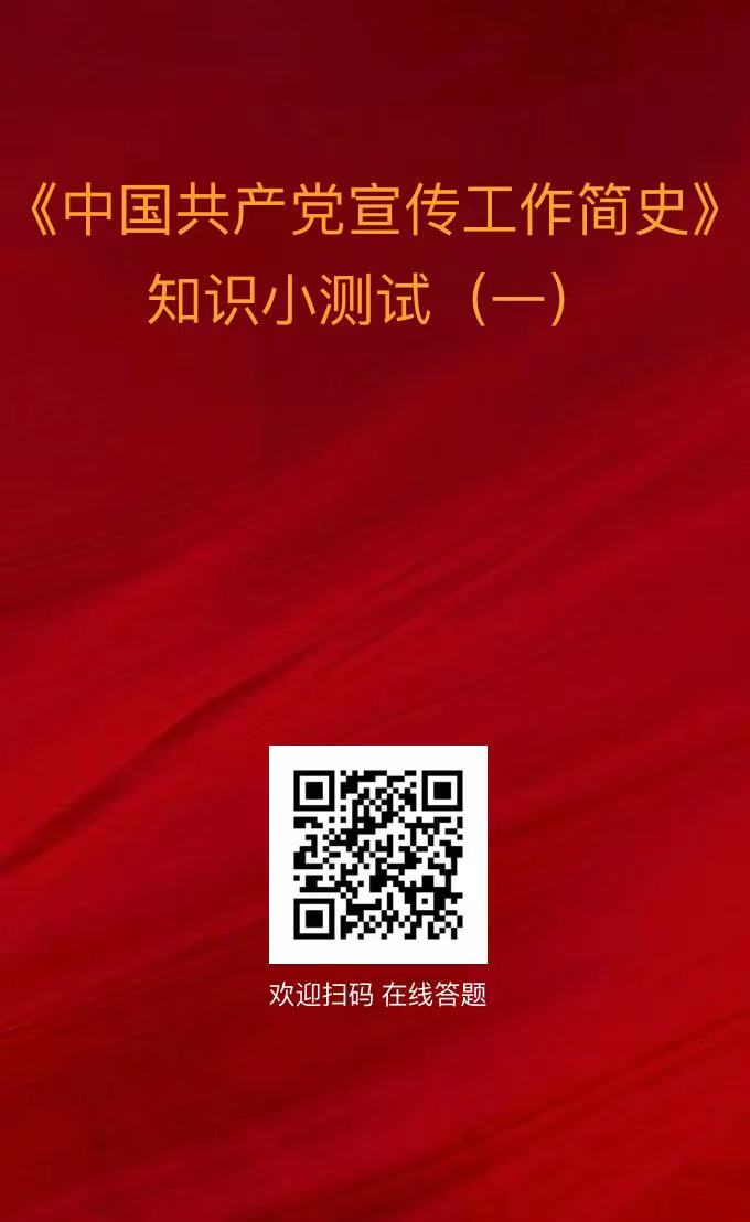 為深入學習《中國共產黨宣傳工作簡史》,推動黨員群眾全面了解黨的宣傳史上重要思想、重要方針、重要事件、重要活動,進一步深刻認識“兩個確立”的決定性意義,增強“四個意識”、堅定“四個自信”、做到“兩個維護”,特開設“《中國共產黨宣傳工作簡史》知識小測試”欄目,歡迎廣大讀者積極掃碼參與答題。