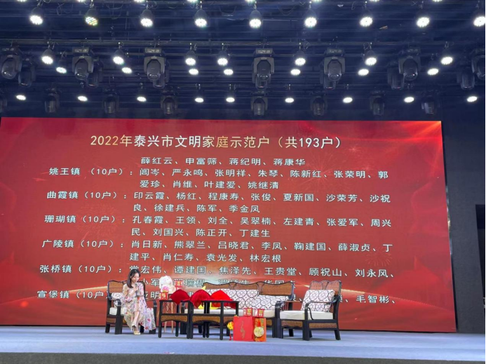 傳承好家風,一起話團圓。活動現(xiàn)場對193戶2022年度泰興市文明示范家庭進行表彰。文明家庭代表們孝老愛親、助人為樂、熱心公益、家風傳遞的感人故事,通過節(jié)目演出、事跡短片播放、現(xiàn)場采訪、故事分享等環(huán)節(jié)生動展現(xiàn)。一句句真摯樸實的話語,一幅幅溫馨感人的畫面,讓大家在中秋佳節(jié)共同感受家的和諧與溫馨,共同感受文明的魅力和風采。 泰興市將文明家庭評選作為創(chuàng)建全國文明城市的“細胞工程”,通過層層推薦、嚴格把關,積極推薦、培育和選樹文明家庭典型,結合“喜迎二十大”“學習回信精神”等主題活動,大力宣傳文明家庭的感人事跡和崇高精神,讓文明之風地吹拂到全社會各個角落。