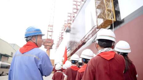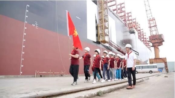 少先隊員們來到揚子鑫福造船施工現場,現場觀摩了目前在建的全球最大的集裝箱船——24000TEU集裝箱船,現場聽取了企業(yè)在建造世界最大礦砂船、集裝箱船時相關經歷。在企業(yè)負責人帶領下,少先隊員們首次直面頂尖造船企業(yè)的龍頭產品,既開闊了眼界,更對造船行業(yè)的技術力量有了初步認識。