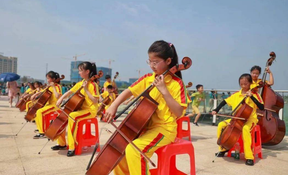 其實(shí)早在十年前,泰興市就注重全民音樂文化的浸潤(rùn)。黃橋小學(xué)的錢慧老師是見證者,也是參與者。在泰興市黃橋古鎮(zhèn),從2011年開始,為響應(yīng)鎮(zhèn)政府的號(hào)召,學(xué)校在二年級(jí)到五年級(jí)開設(shè)音樂教學(xué)。在普及提琴教學(xué)的同時(shí),學(xué)校一個(gè)年級(jí)成立一個(gè)提琴興趣班,利用每天課間操以及社團(tuán)課的時(shí)間,教孩子們持琴把位、看譜子、彈奏。有的家長(zhǎng)猶嫌不足,課后還帶孩子到當(dāng)?shù)厣鐣?huì)培訓(xùn)機(jī)構(gòu)上小課。